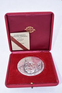 Medaglia commemorativa in argento 800/000, con un ritratto raffigurante Montale su una delle facce e una mano [..]