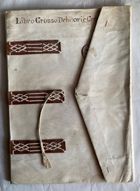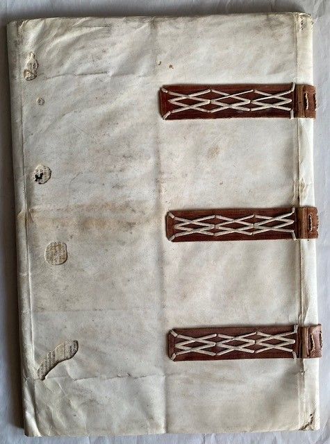 una in pergamena di circa cm 44x31.5, e l'altra in pelle marrone di circa 45x35.5, entrambi secolo 17°, con bandelle esterne di strisce in cuoio (anche quella in pergamena).