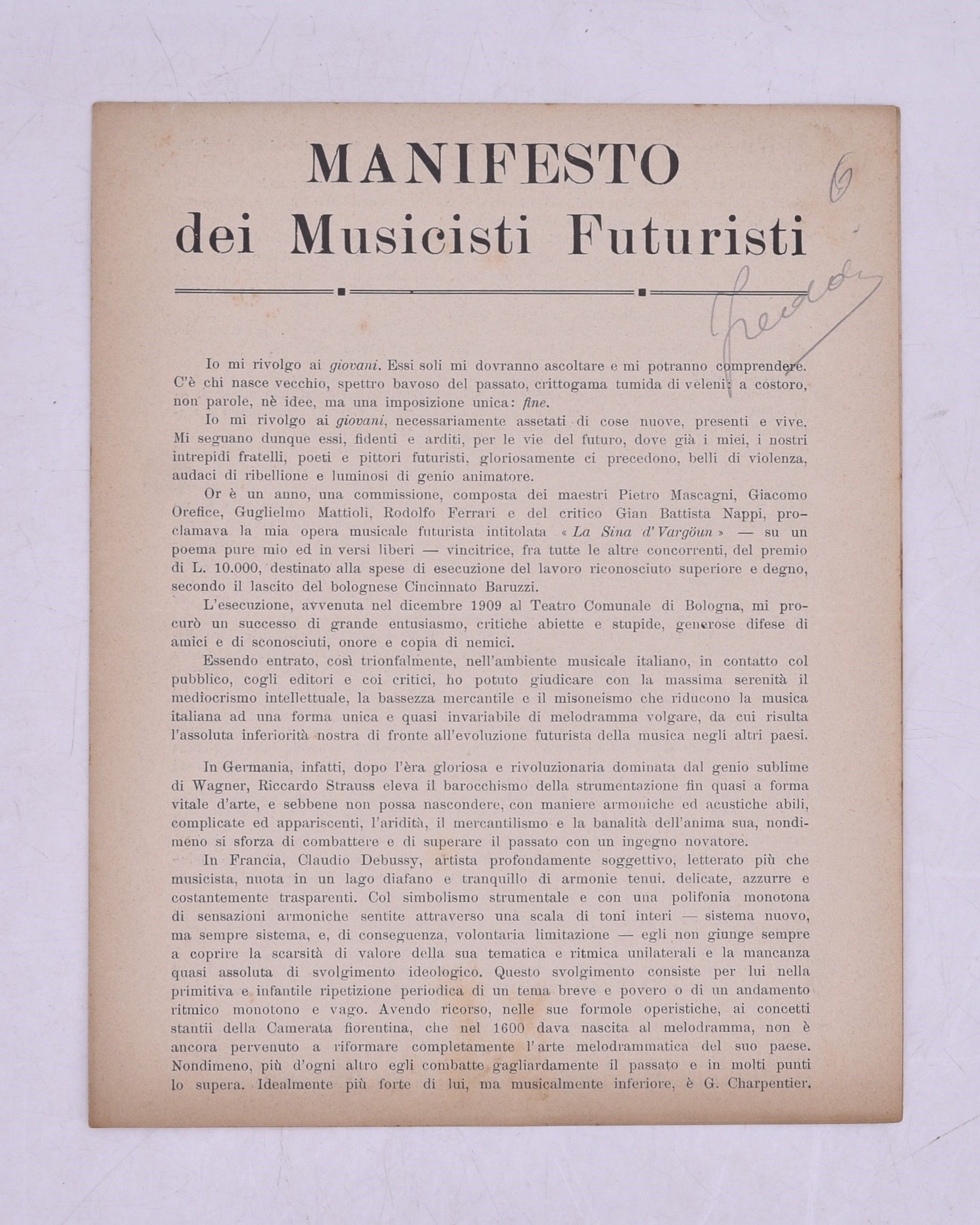 Manifesto teorico di musica futurista con i principii stilistici e programmatici per i compositori e i musicisti aderenti al Movimento futurista. Testo di Francesco Balilla Pratella. Esemplare nell'edizione originale.