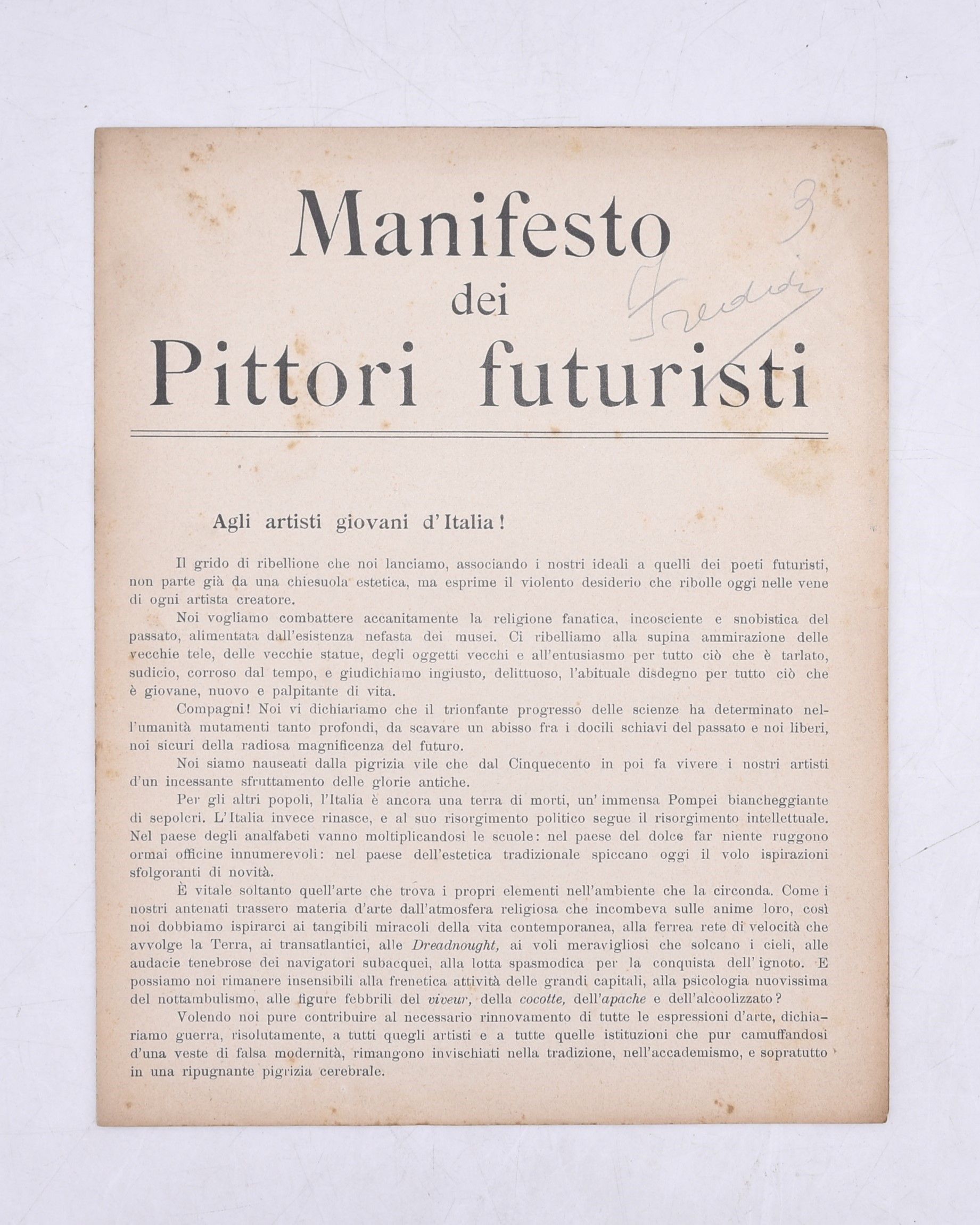 Direzione del Movimento Futurista, Milano, 11 Febbraio 1910, pp. [4], mm. 292 x 230. Ciclostilato. Comunicato stampa con intervento indirizzato agli artisti giovani d'Italia, a firma di Umberto Boccioni, Carlo Dalmazzo CarrĂ , Luigi Russolo, Giacomo Balla, Gino Severini. Esemplare originale.