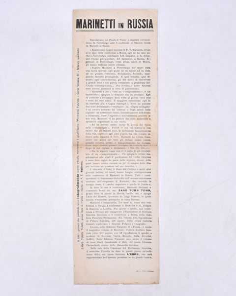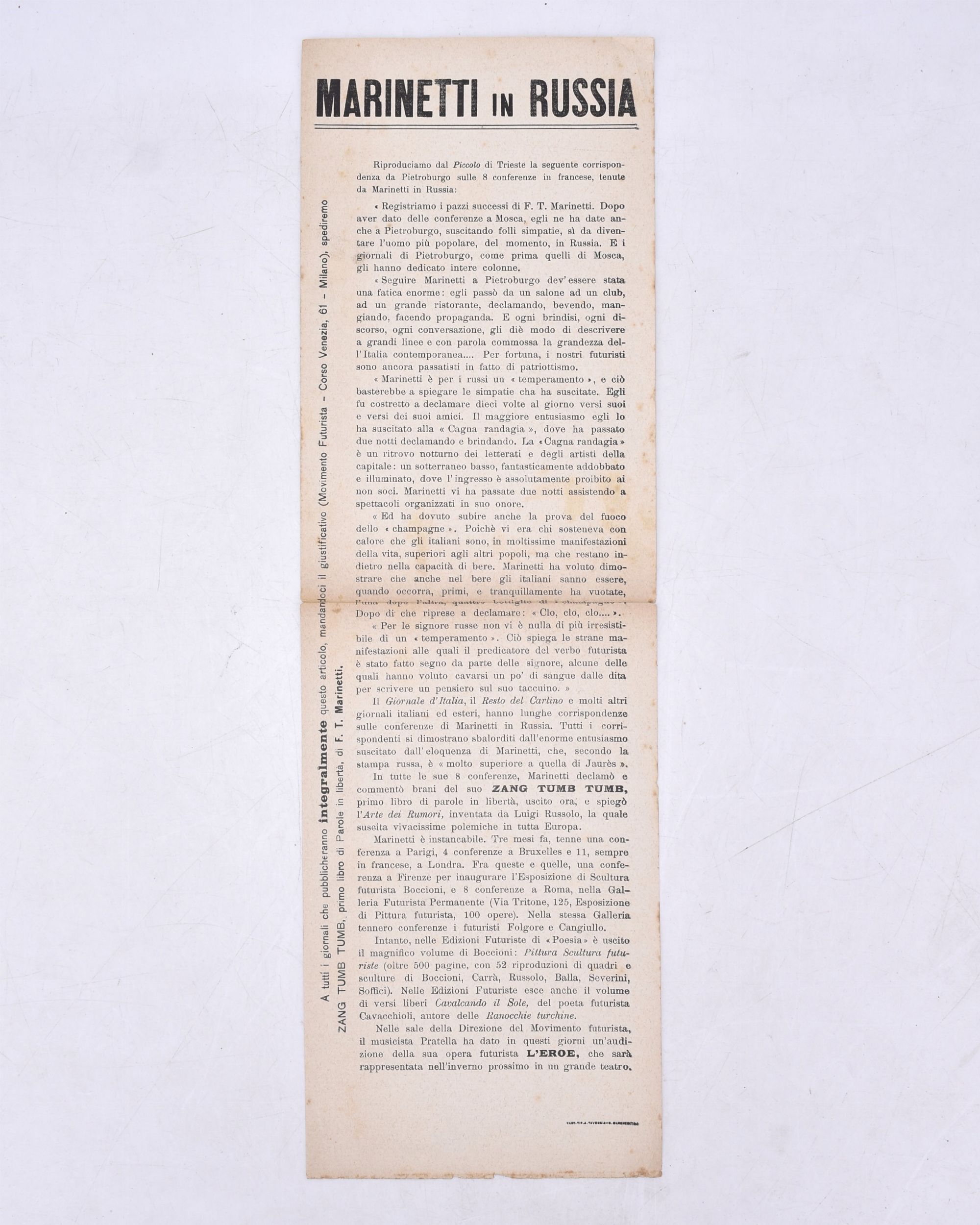 Comunicato stampa con un articolo dedicato alla tournée di F. T. Marinetti in Russia per la presentazione di ZANG TUMB TUMB (1914), primo libro di parole in libertà . Esemplare originale d'epoca, ripiegato al centro.