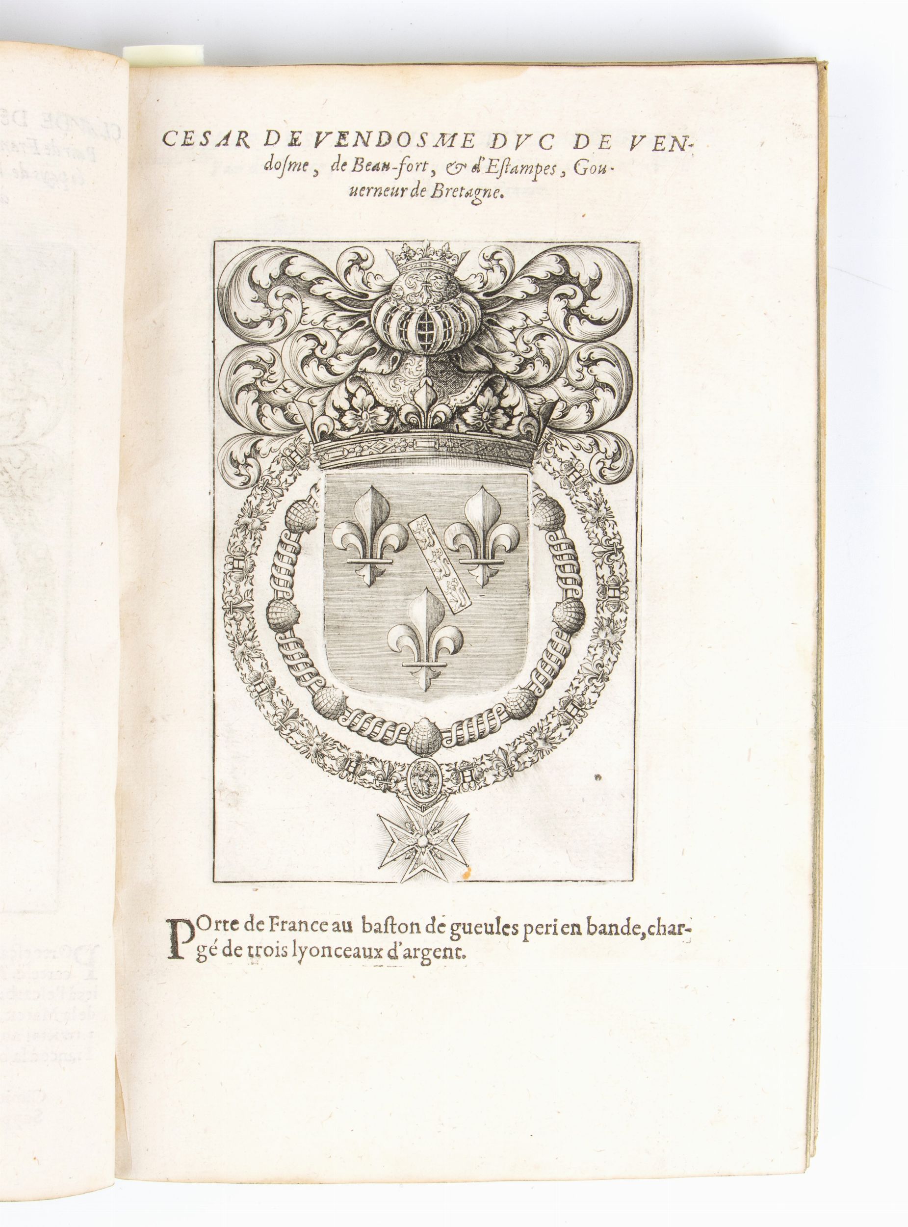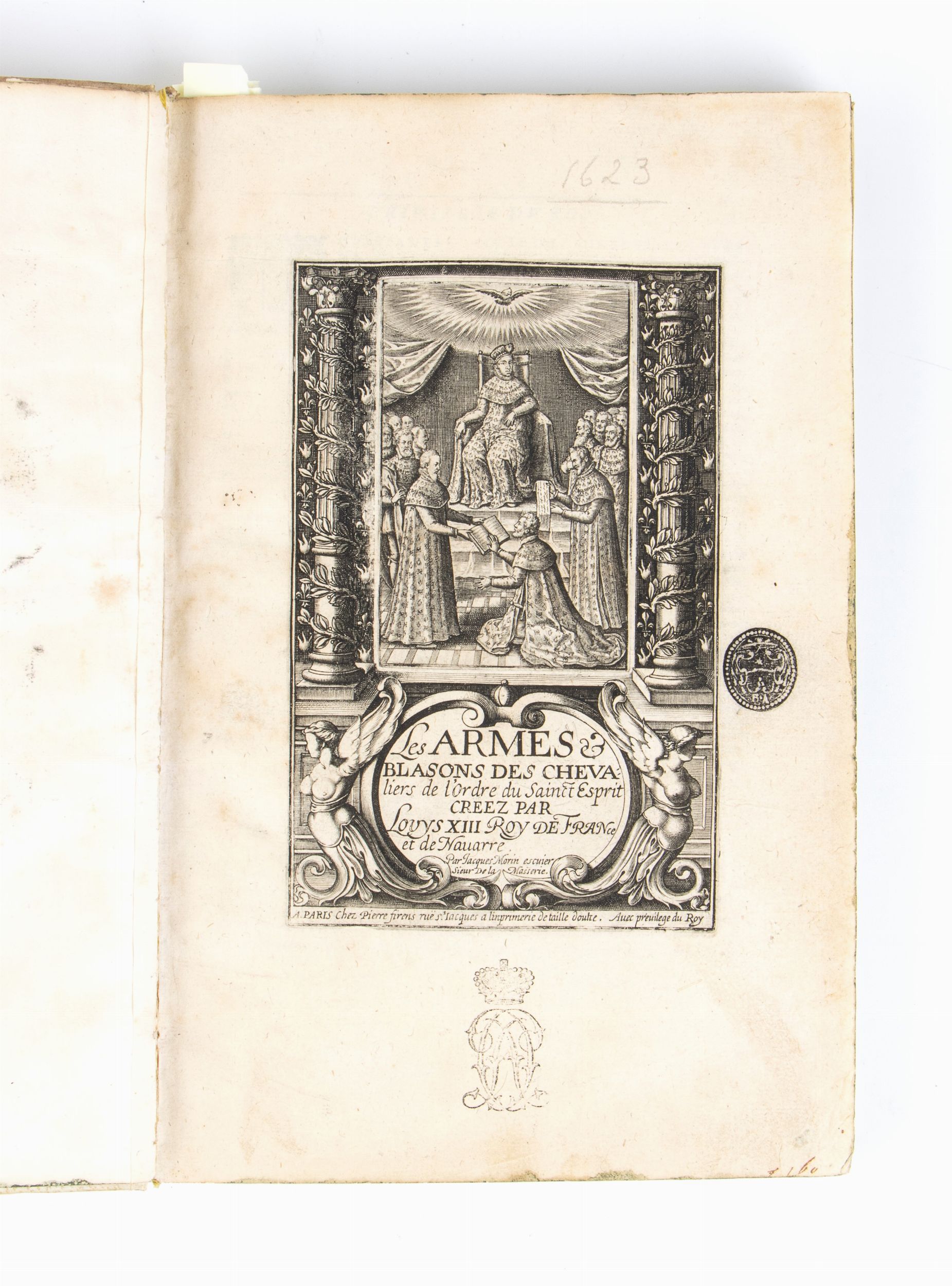 Frontespizio allegorico inciso in rame, (8) pp., 2 tavole con le armi di Luigi XIII e del principe Henry de Bourbon, 1 f. con il titolo: Chevaliers et Commandeurs de l' Ordre di S. Esprit e 78 tavole incise in rame con le armi a piena pagina dei personaggi descritti.