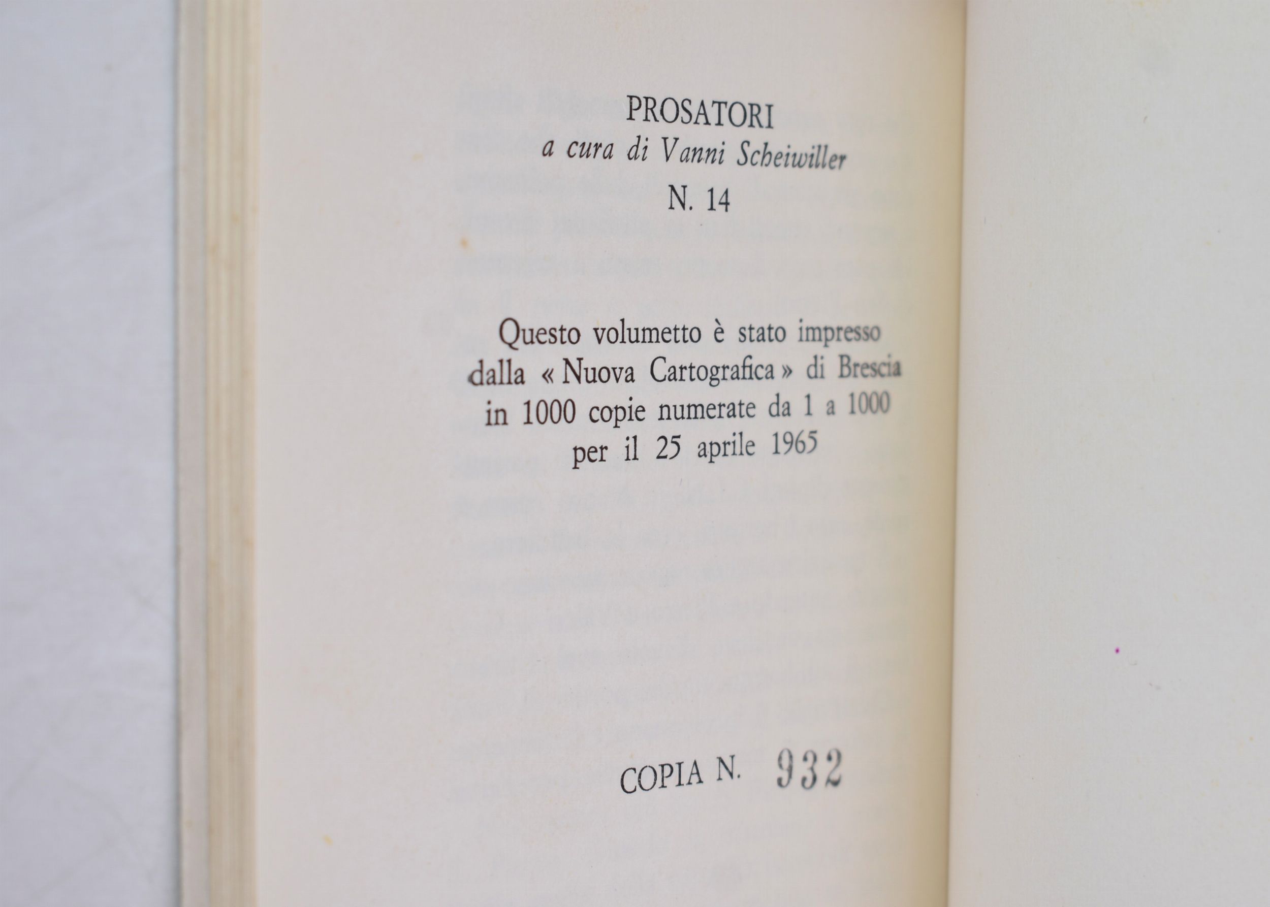Prima edizione, collezione Prosatori. Tiratura numerata, es. n. 932/1000.