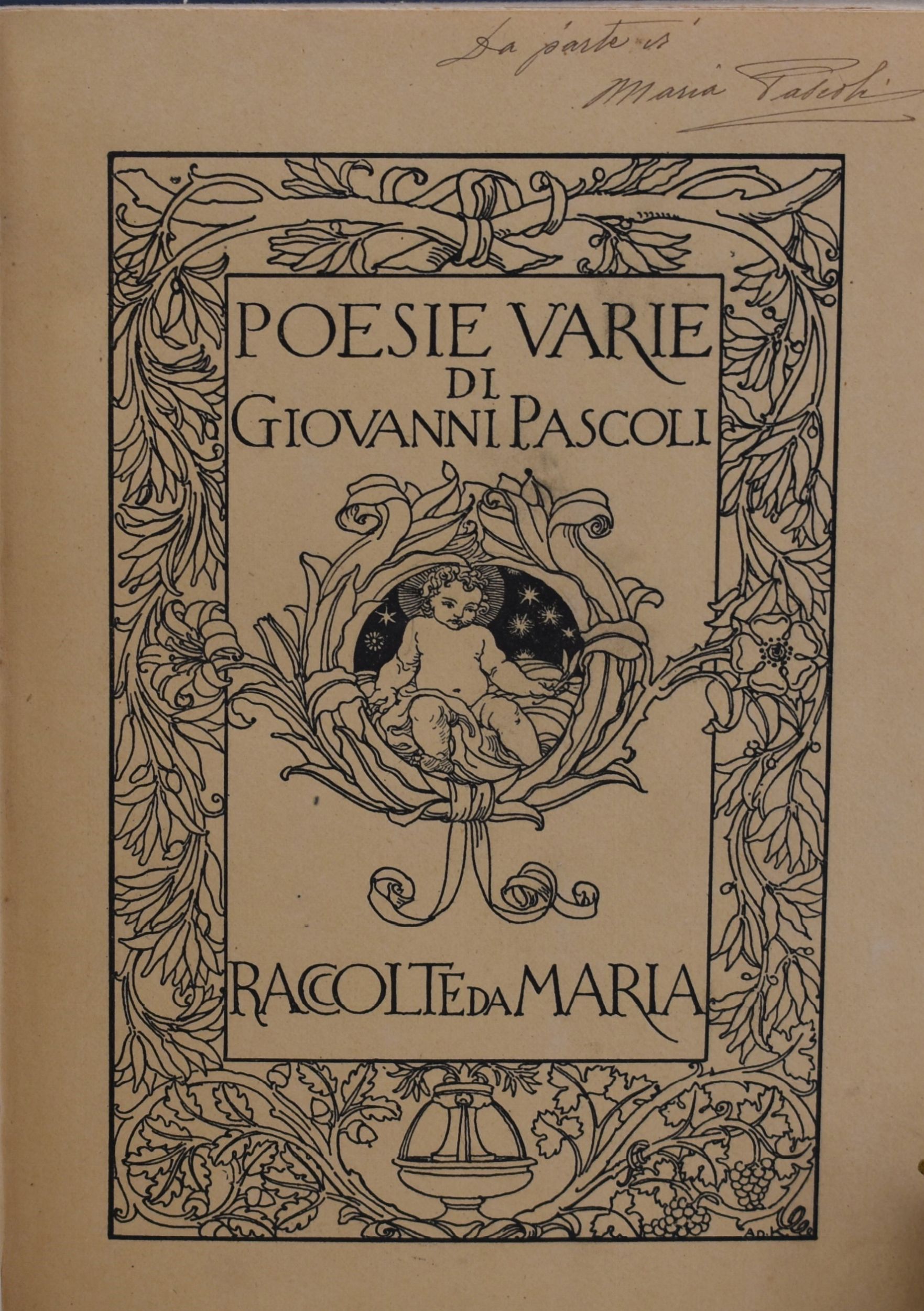 Prima edizione. Copia dono di Maria Pascoli. Ritratto dell'A. in antiporta, tav. ill. con fac-simile, fregi di Adolfo De Carolis. Esemplare rilegato in piena tela celeste con titoli in oro al dorso. * Esemplare proveniente dalla biblioteca privata di Adolfo De Carolis.