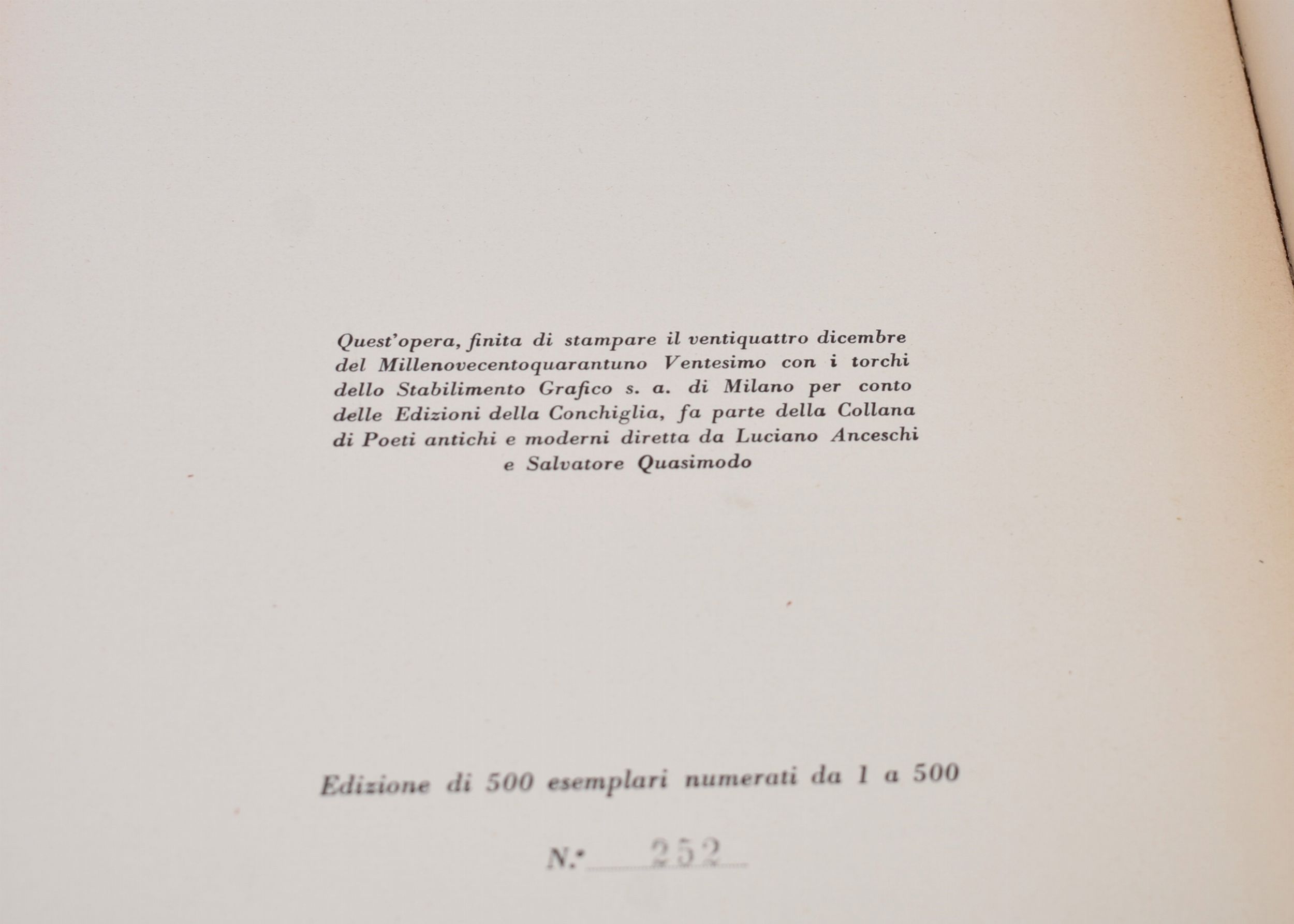 Prima edizione, tiratura numerata, es. n. 252/500. Primo volume della collezione diretta da S. Quasimodo e L. Anceschi. Volume illustrato con tavole f.t. Brossura editoriale con fregio in rilievo al piatto. Esemplare con copertina distaccata.