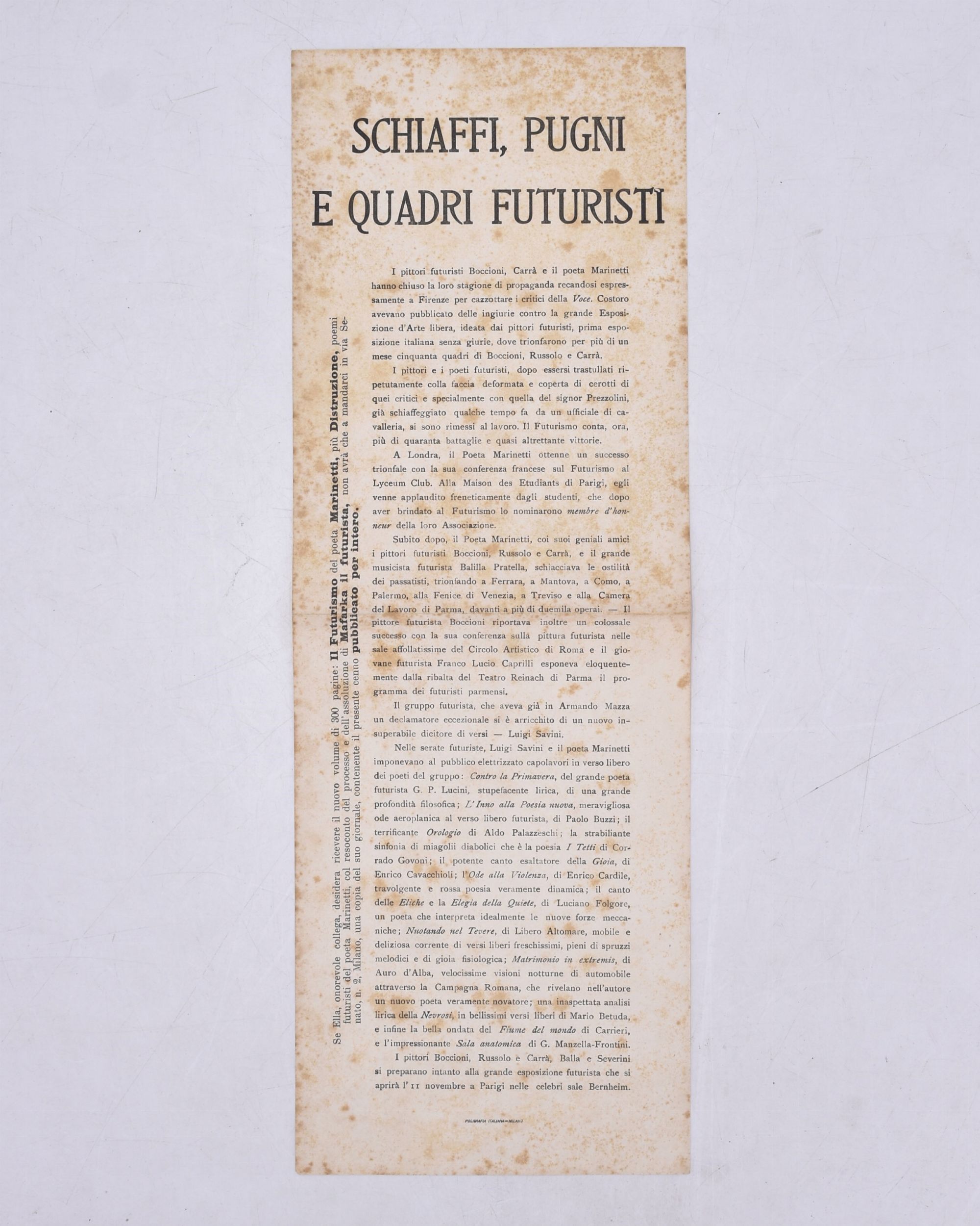 L'articolo porta abbondante acqua al mulino futurista, citando gli entusiastici riscontri del pubblico presente alle serate futuriste. Opuscolo stampato poche settimane prima della grande esposizione futurista del 1915 a Parigi nella galleria Bernheim.Forse uno dei piĂ¹ importanti e rappresentativi manifesti della nascita del Futurismo. L'esemplare presenta fioriture sparse.