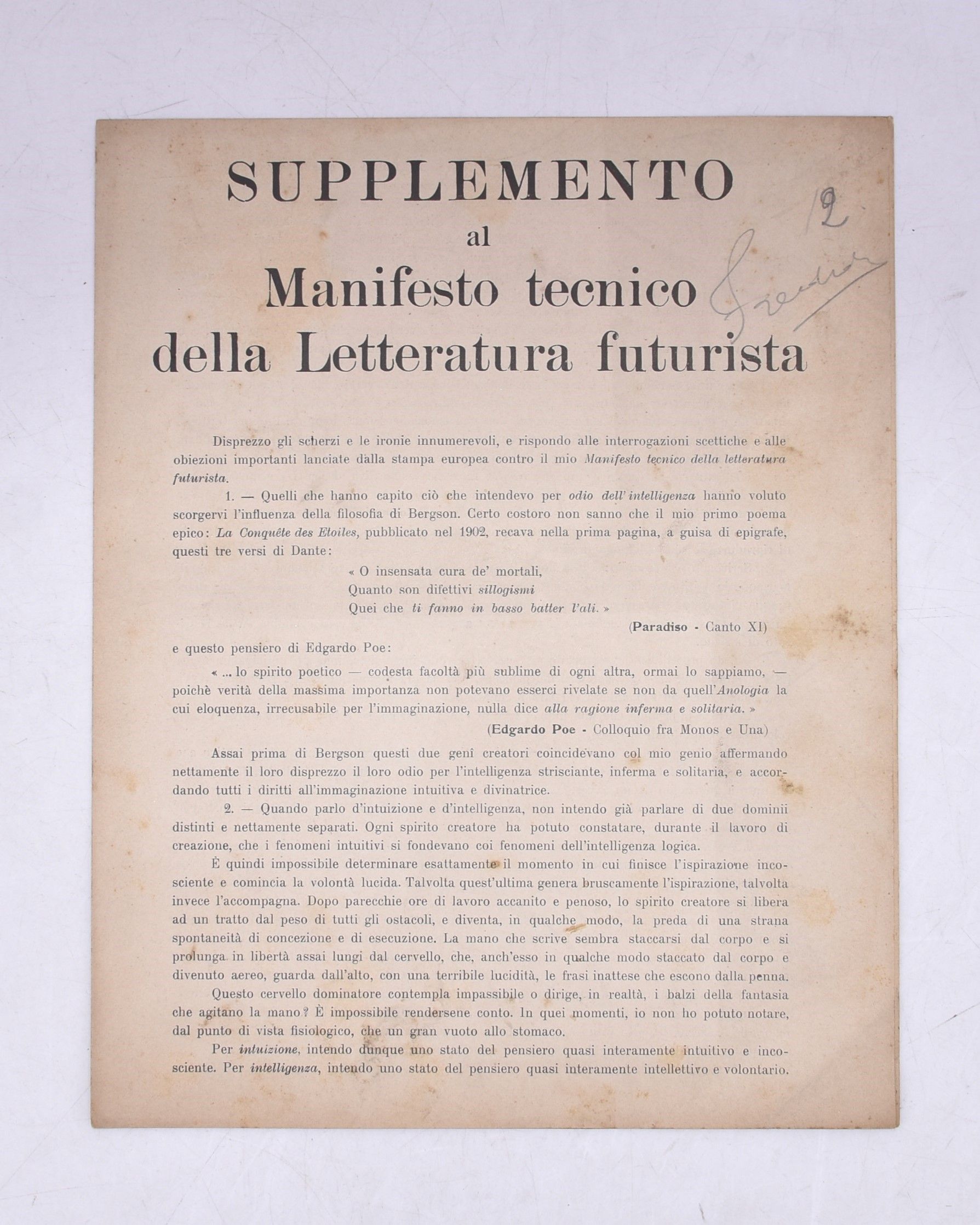 Testo futurista di Marinetti datato 11 Agosto 1912.Lo scritto segue programmaticamente il Manifesto Tecnico della Letteratura Futurista dello stesso anno (vedi sopra). Edizione originale.