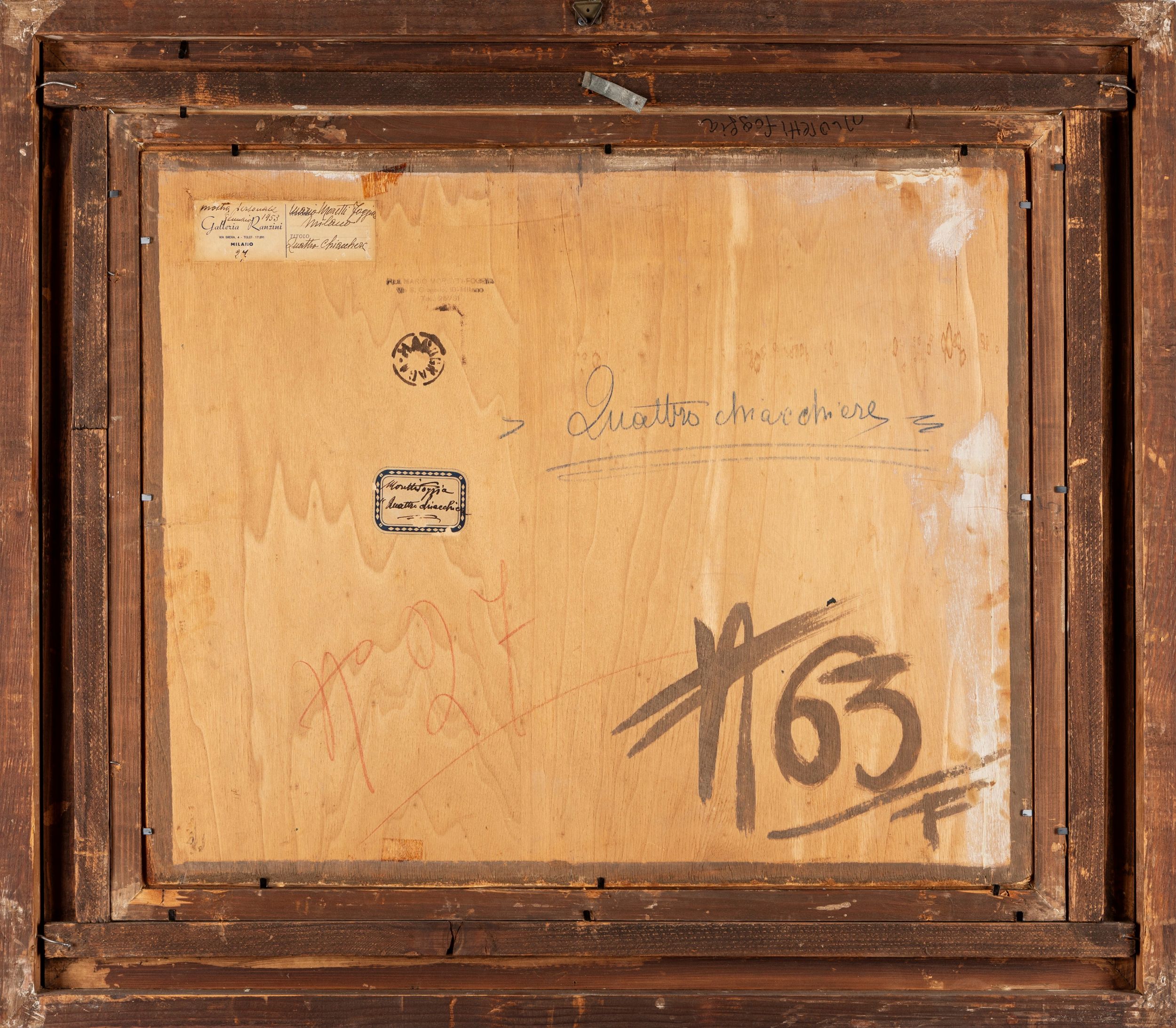 al retro, sul compensato, timbro del pittore, etichetta del pittore con titolo ed etichetta di esposizione della Galleria Ranzini (Mostra personale, gennaio 1953)