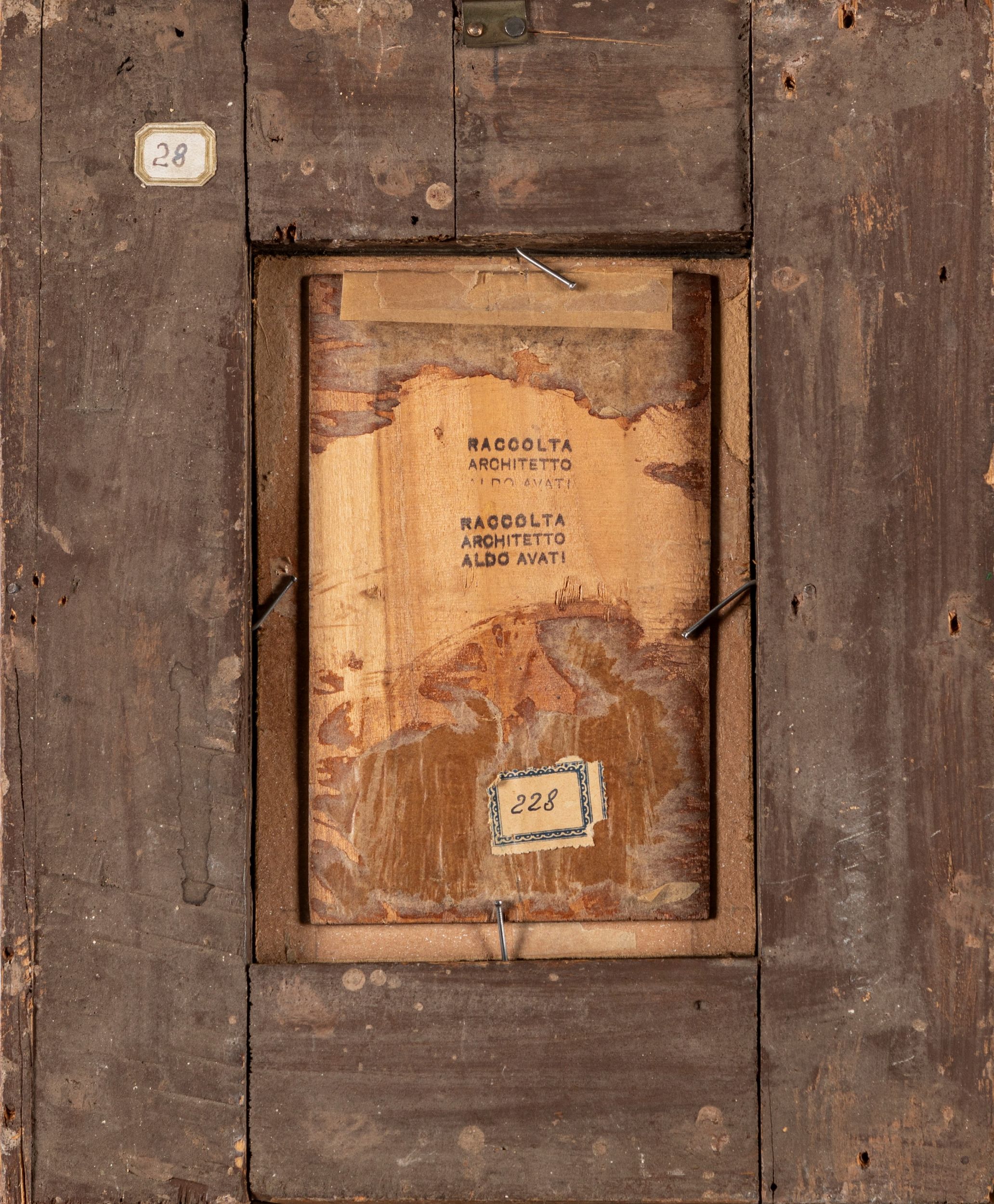 al retro, sulla tavola, timbri della raccolta dell'architetto Aldo Avati ed etichetta di inventario con numero 228; sulla cornice altra etichetta di inventario con numero 28