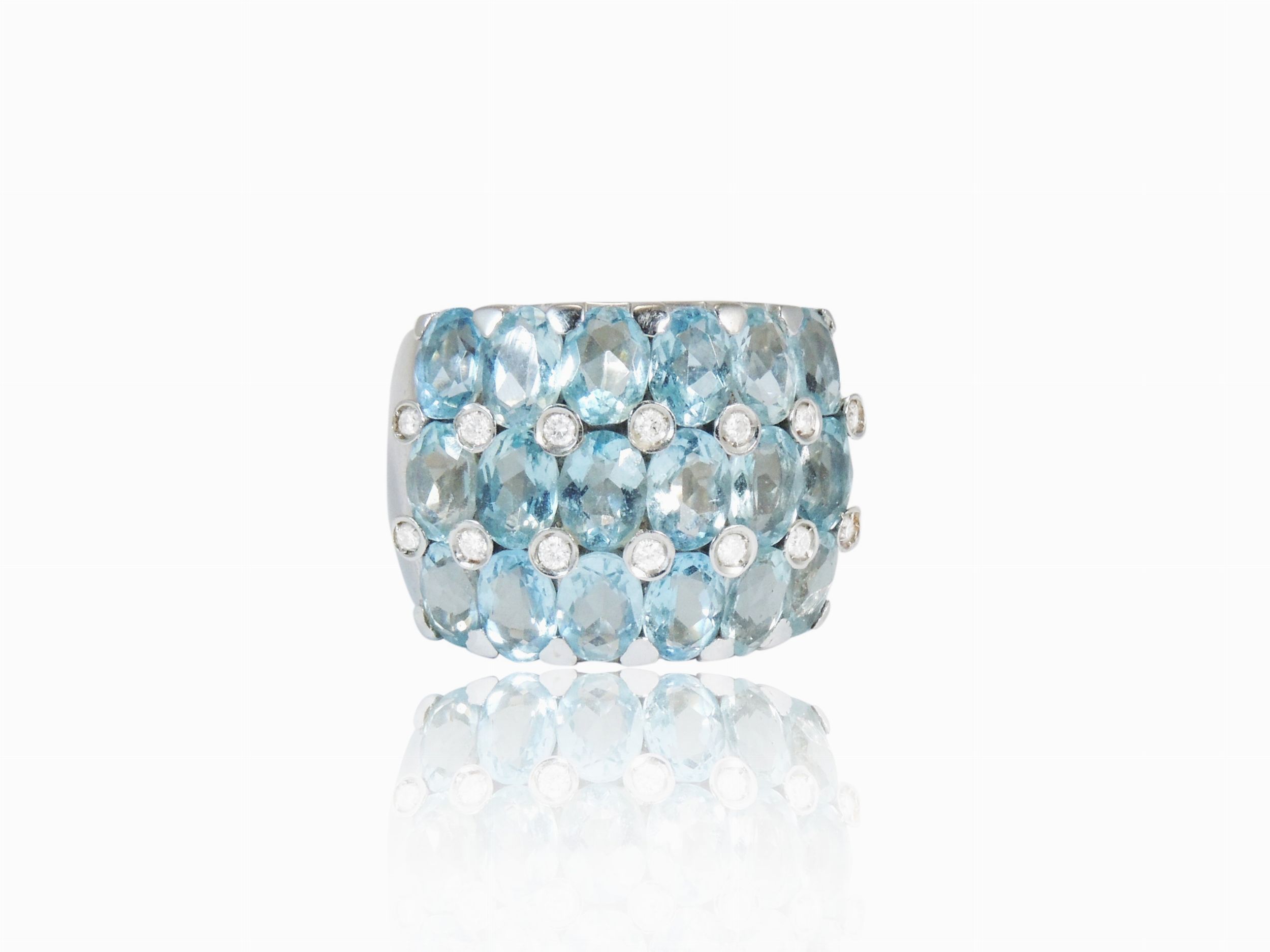 Anello a fascia in oro bianco con diamanti e acquamarine
