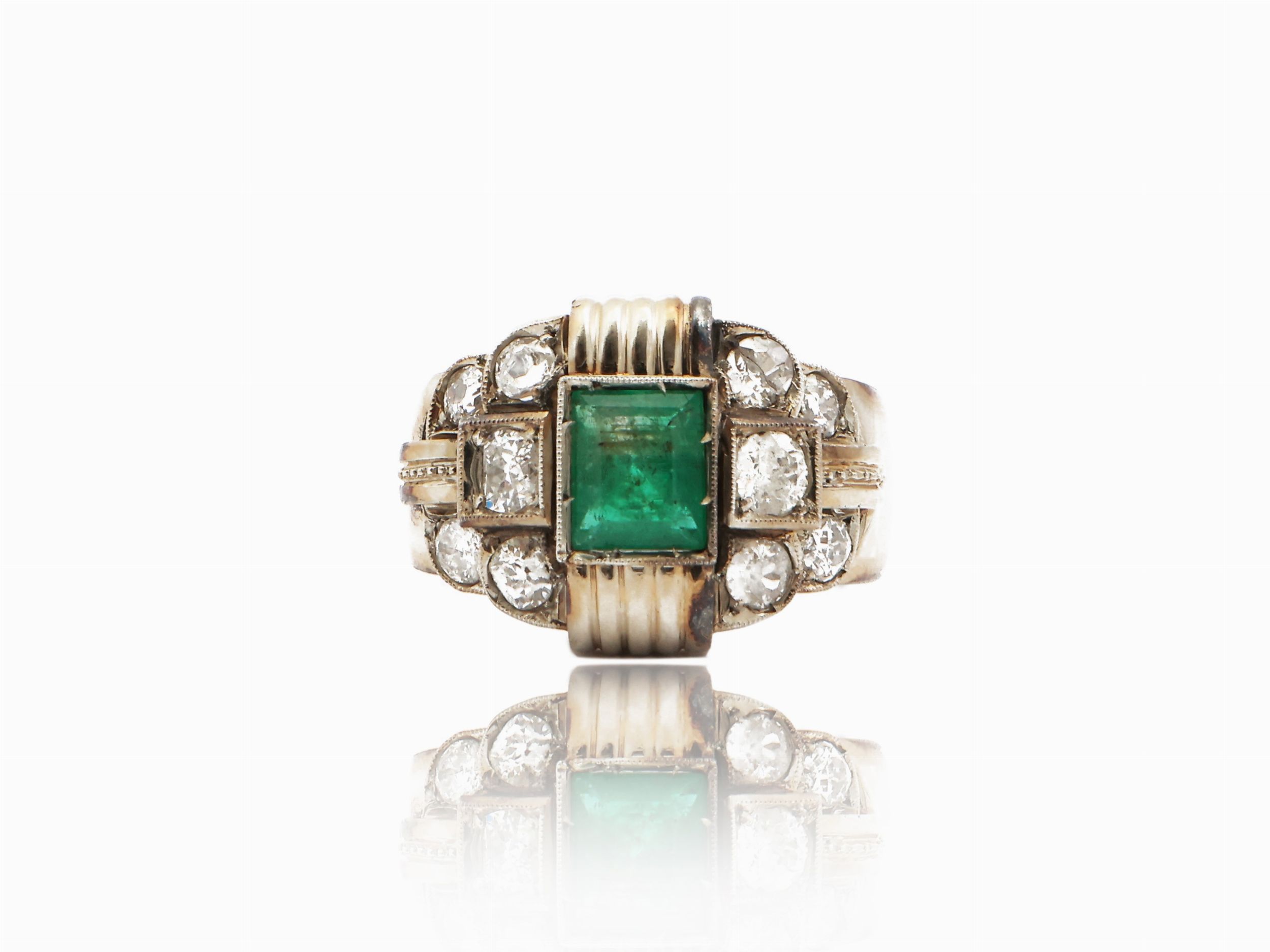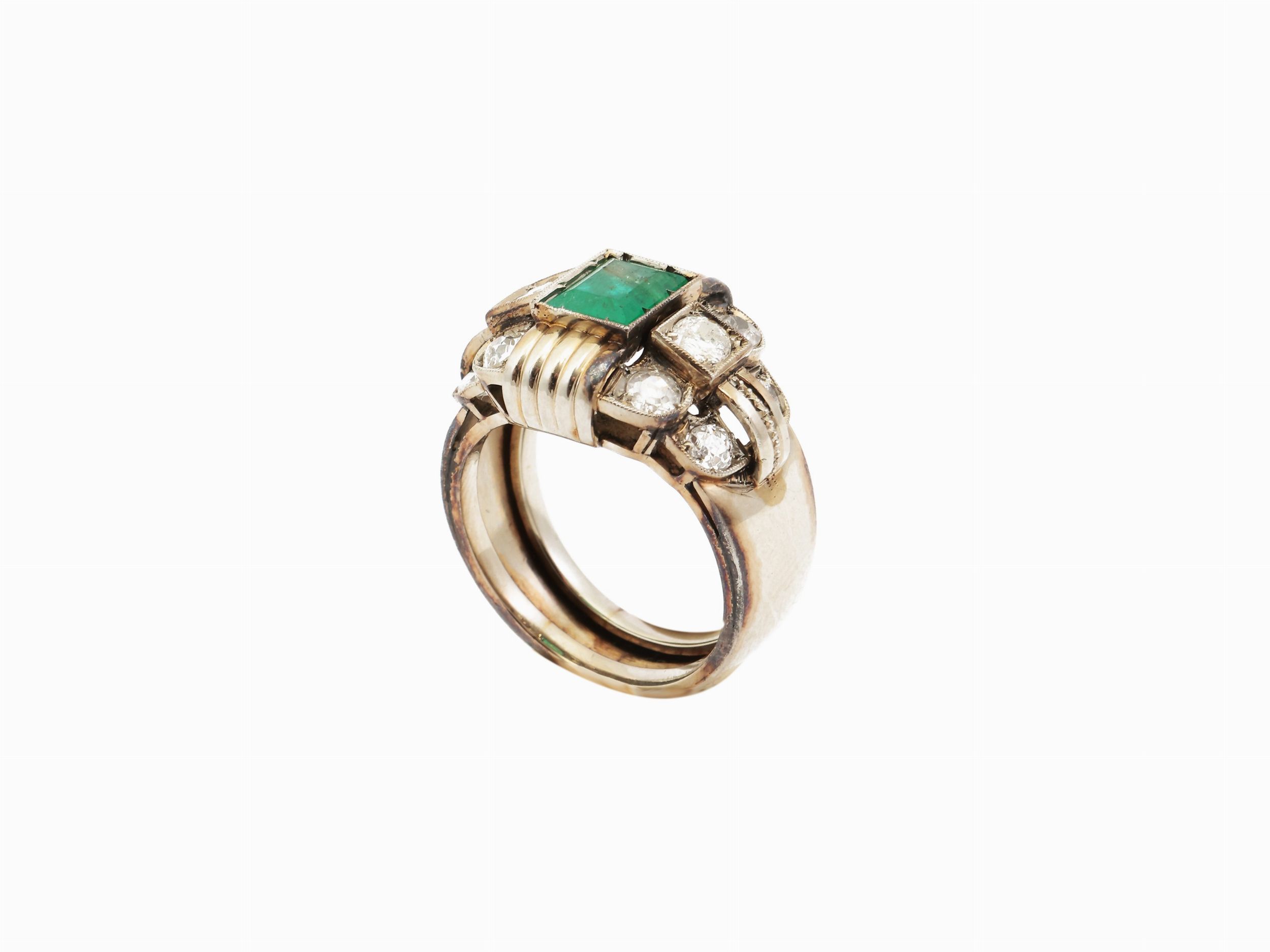 Anello a fascia in oro bianco e giallo con diamanti e smeraldo
