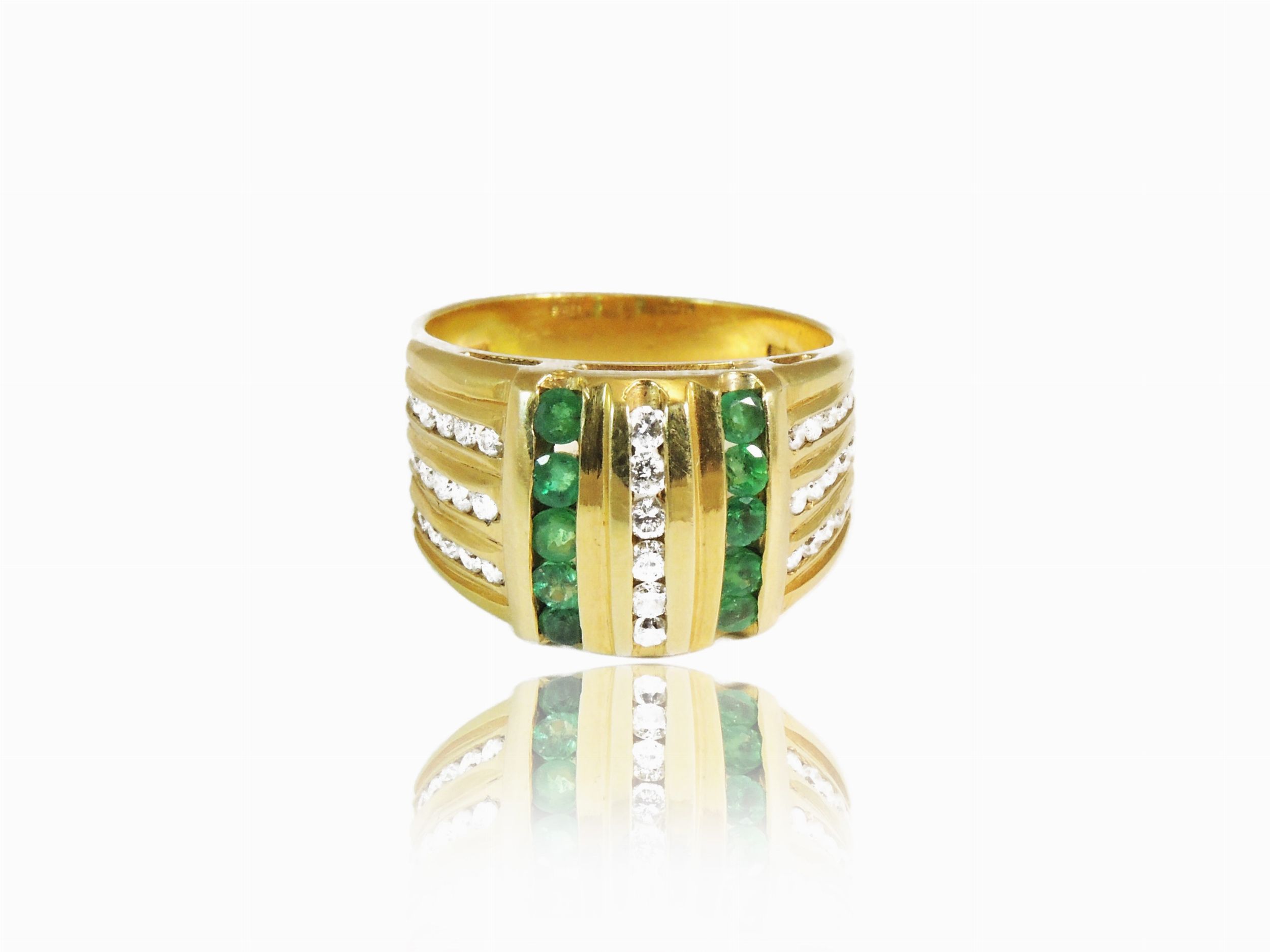 Anello a fascia in oro giallo con diamanti e smeraldi
