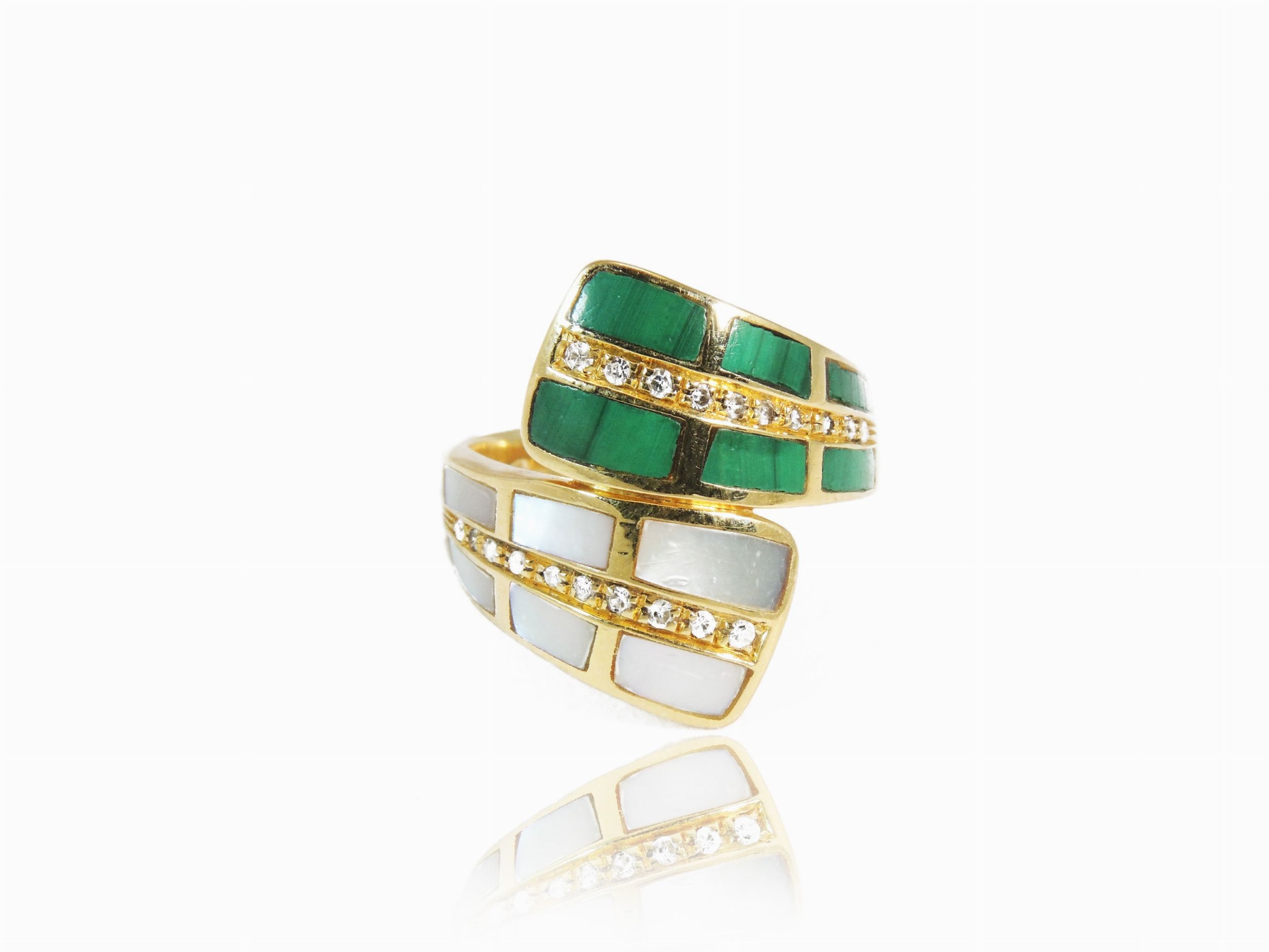 Anello contrarič in oro giallo e diamanti con intarsi in madreperla e malachite