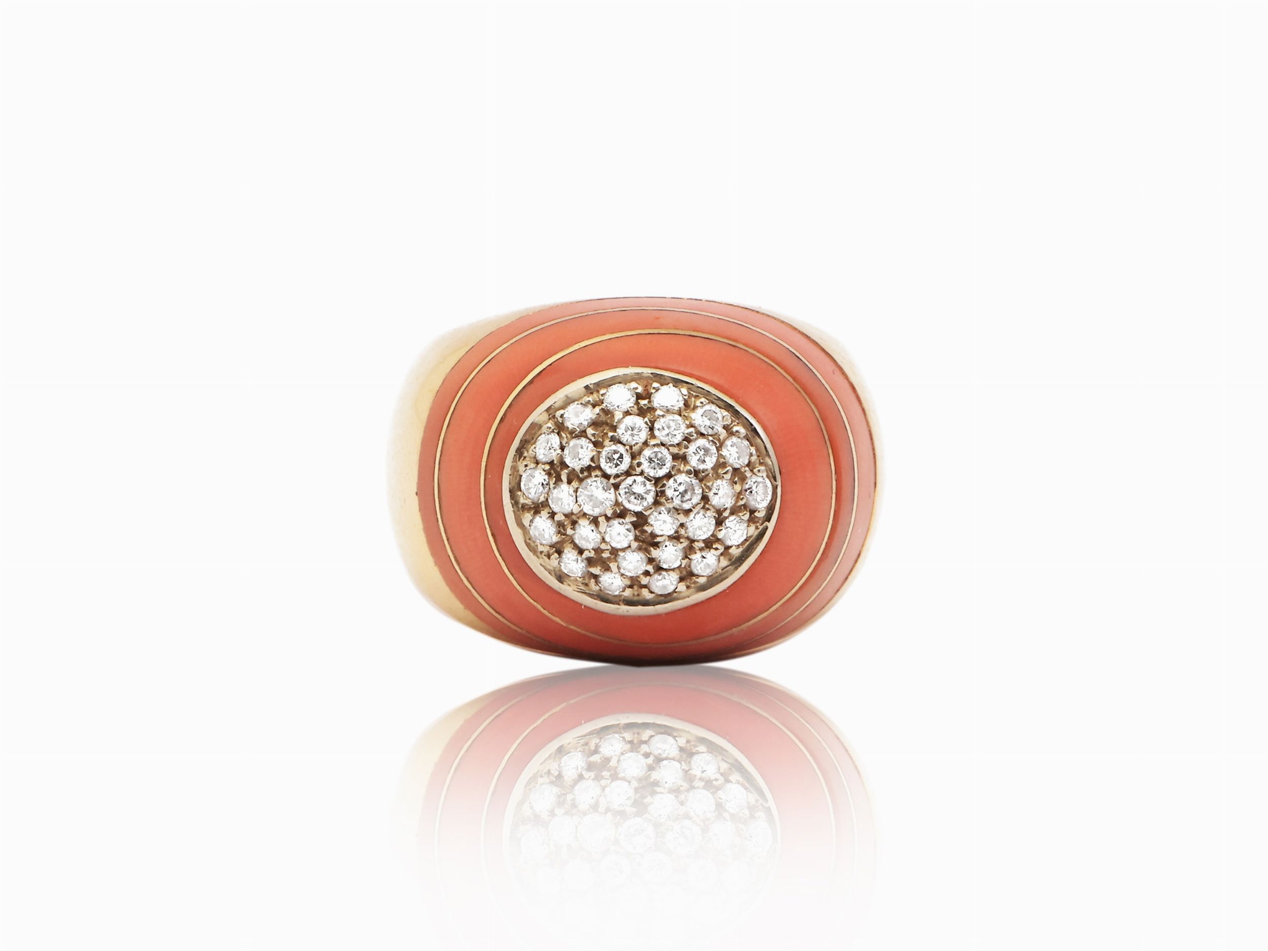 Anello in oro giallo con diamanti e corallo rosa arancio
