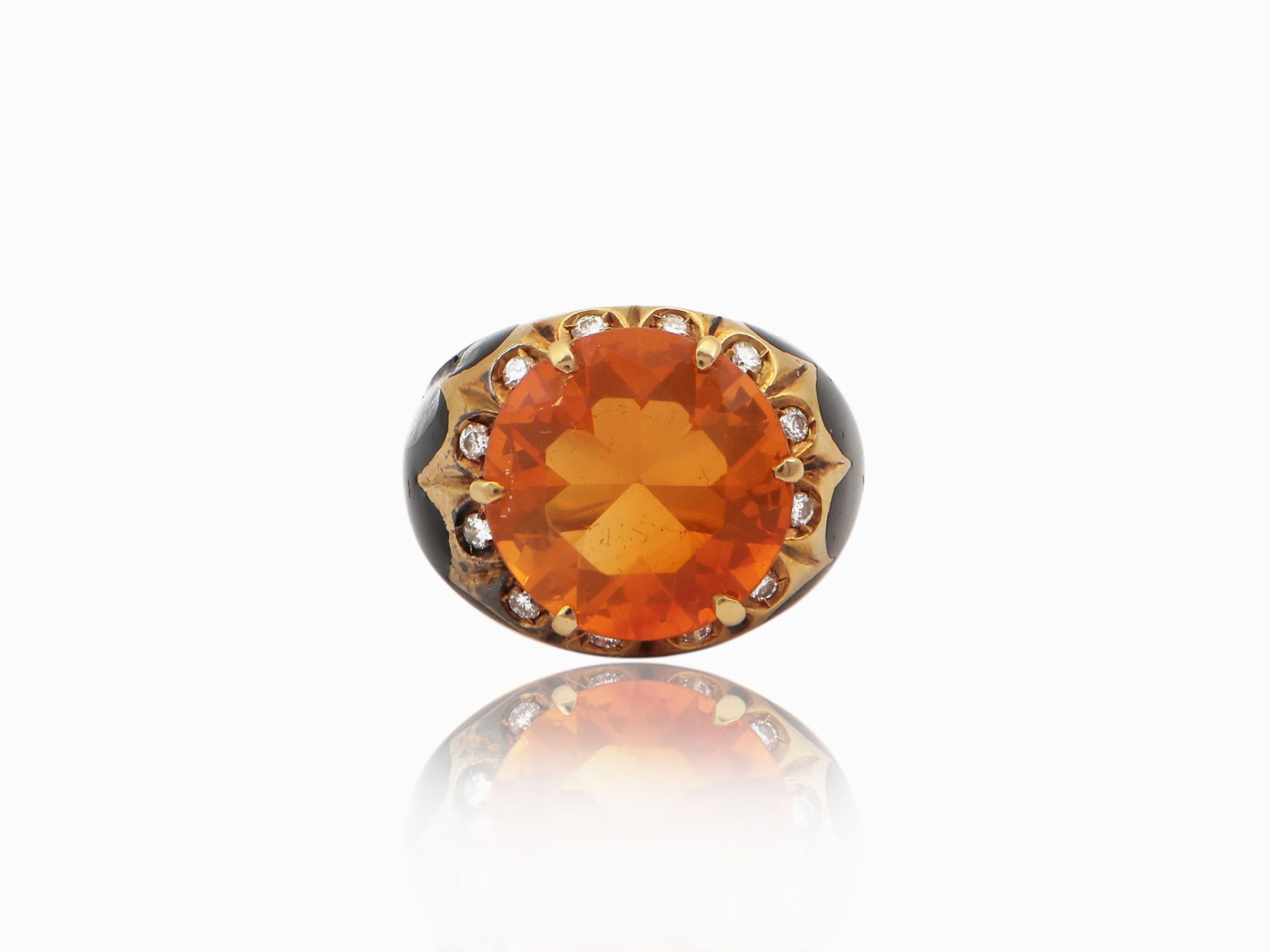 Anello in oro giallo con diamanti, smalti neri e gemma arancio