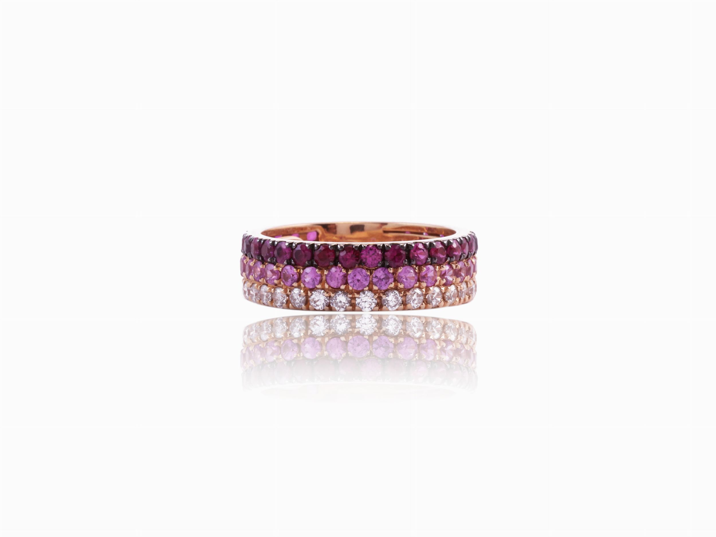 Anello in oro rosa con diamanti, rubini e corindoni rosa