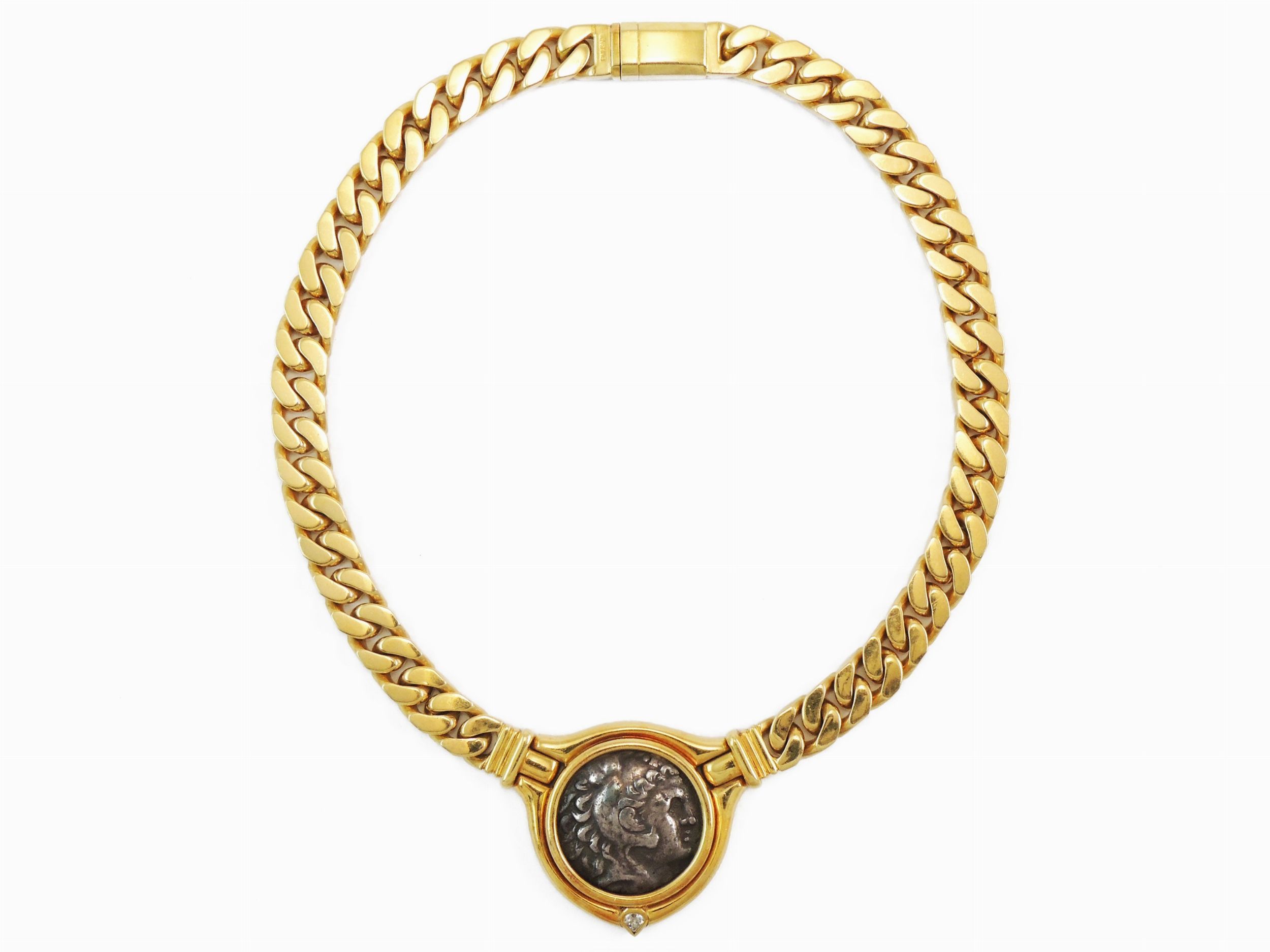 Anni Ottanta realizzato a maglia groumette, al centro un Tetradramma di Alessandro Magno (336-323 a.C) in argento