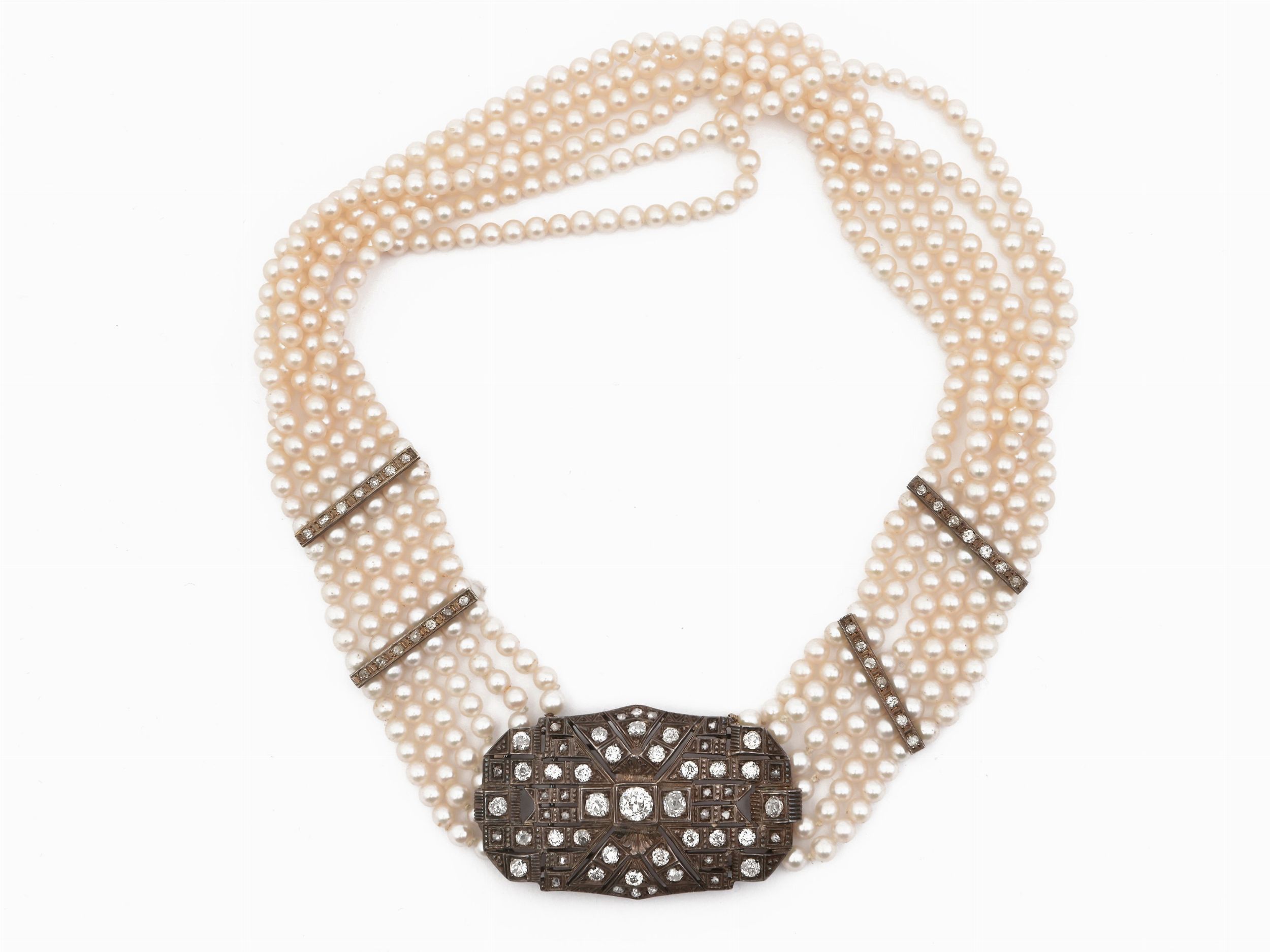 Collana multifilo di perle coltivate con fermezza ed elementi in argento e diama [..]