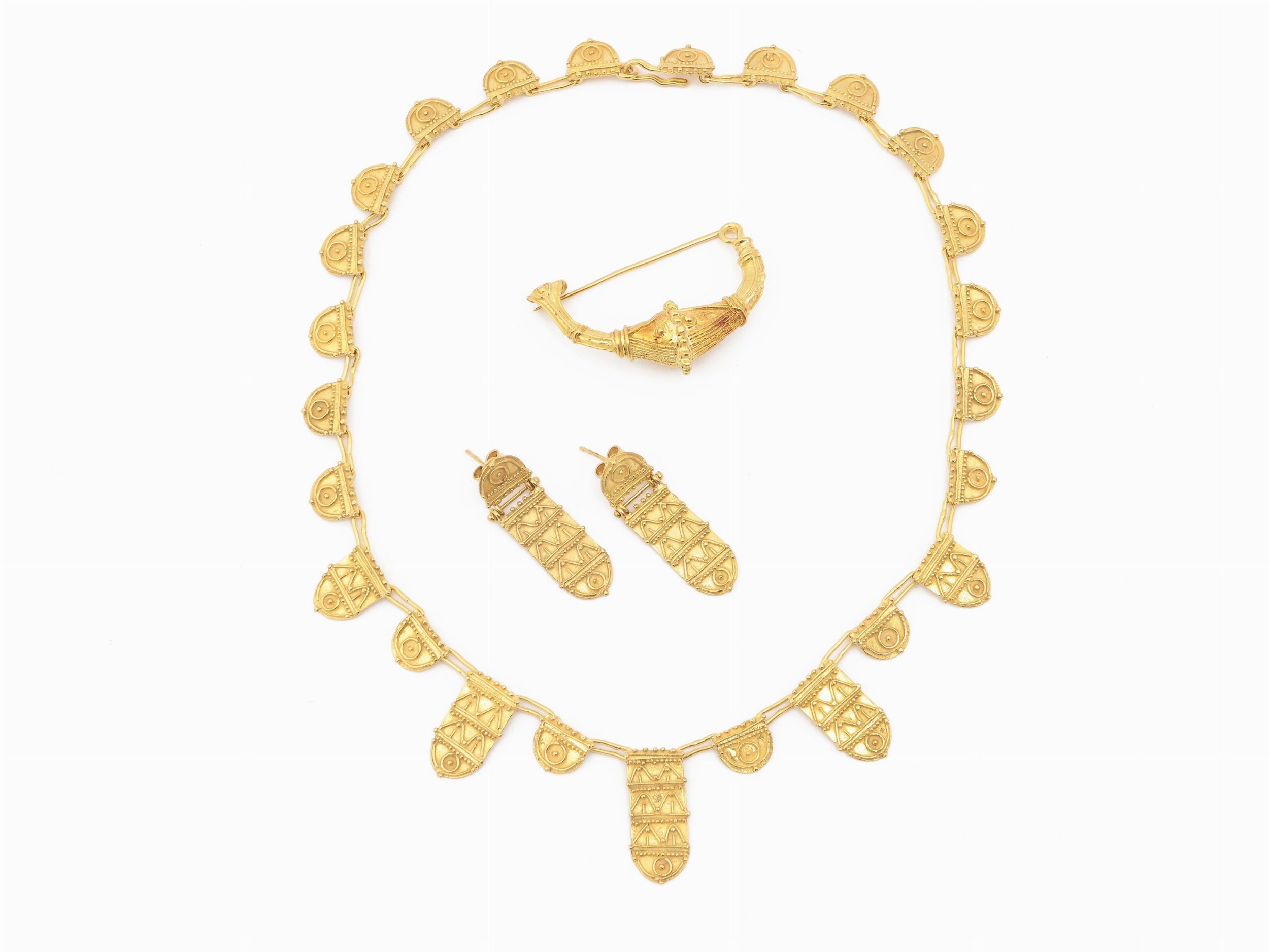 Lunghezza collana cm 40,5, lunghezza orecchini cm 3,5, lunghezza spilla cm 4, 5