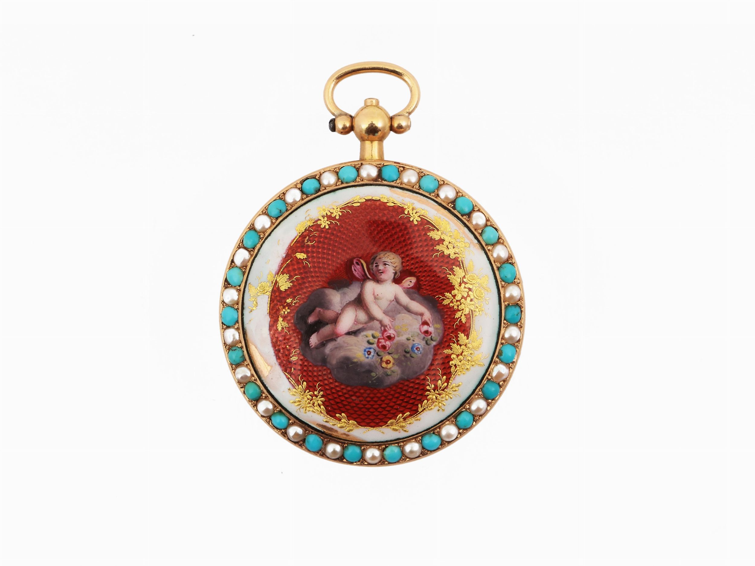 diametro mm 32 XIX secolo movimento meccanico manuale, cassa a due corpi in oro giallo impreziosita da microperle, turchesi e smalti policromi, sul fondello rappresentato un angioletto, quadrante in porcellana con numeri arabi. Funzionante, consigliata revisione.