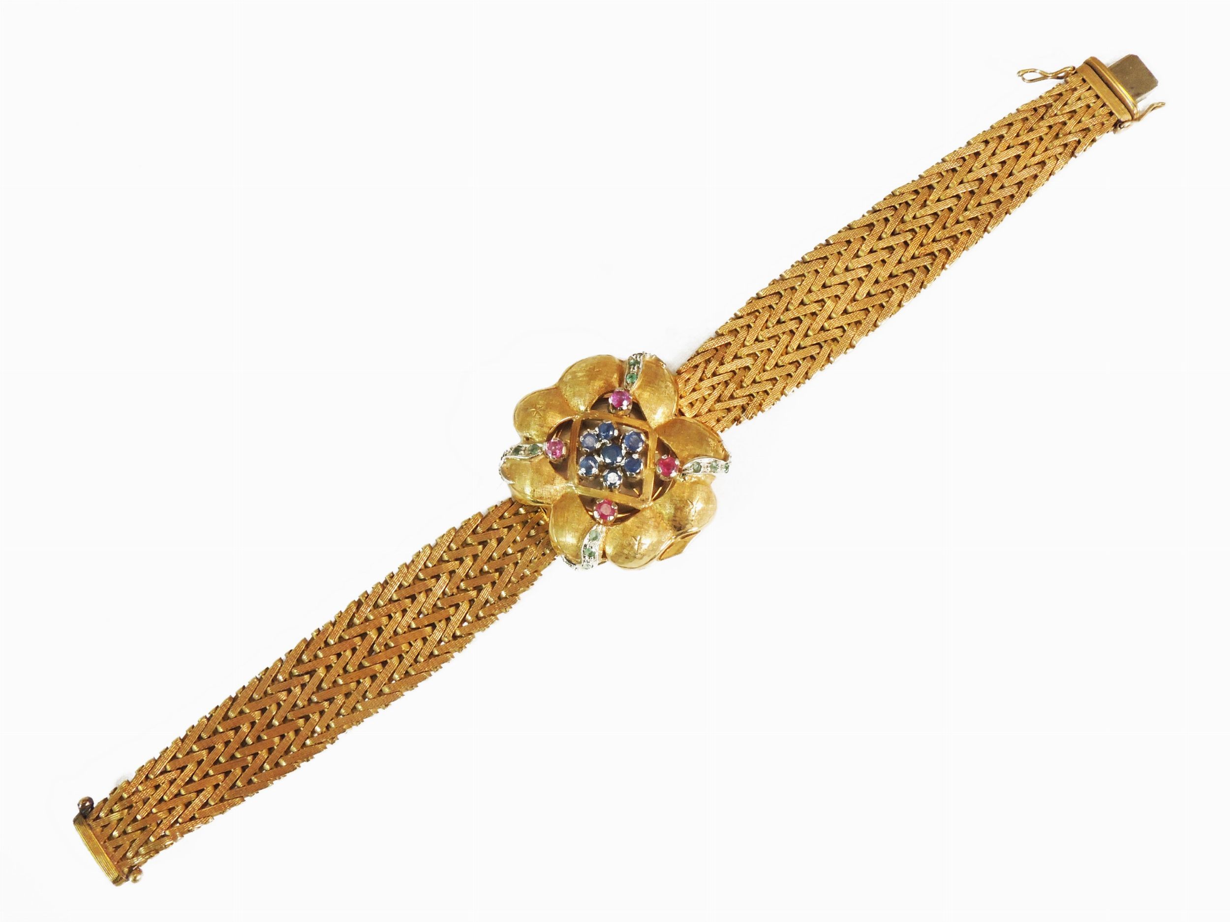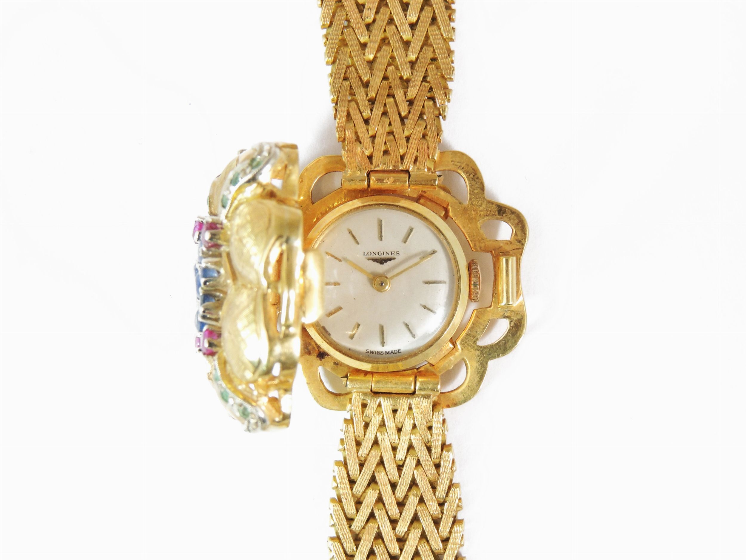 Longines, orologio gioiello in oro giallo con rubini, zaffiri e smeraldi