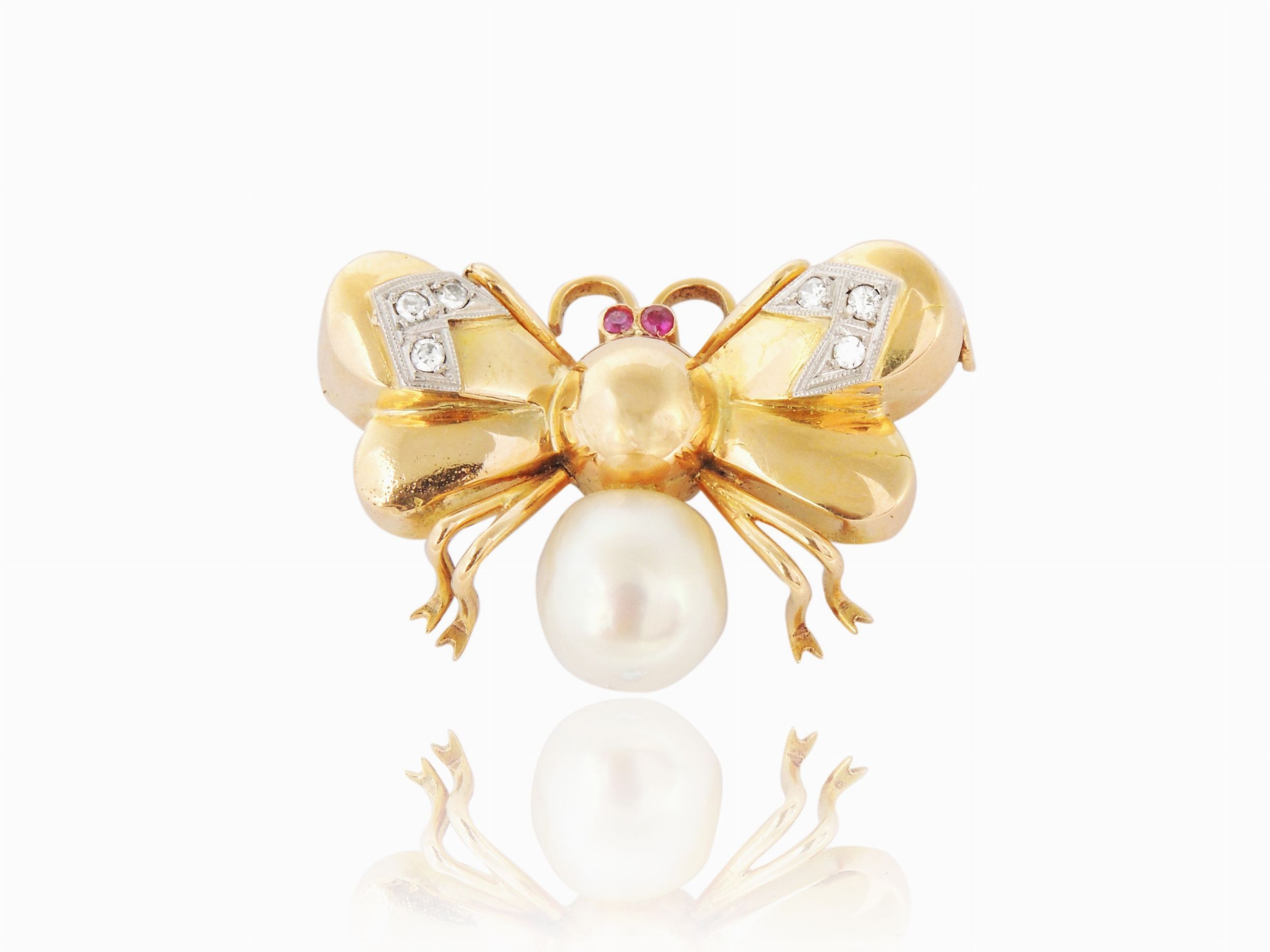 Spilla animalier in oro giallo con diamanti, rubini e perla coltivata