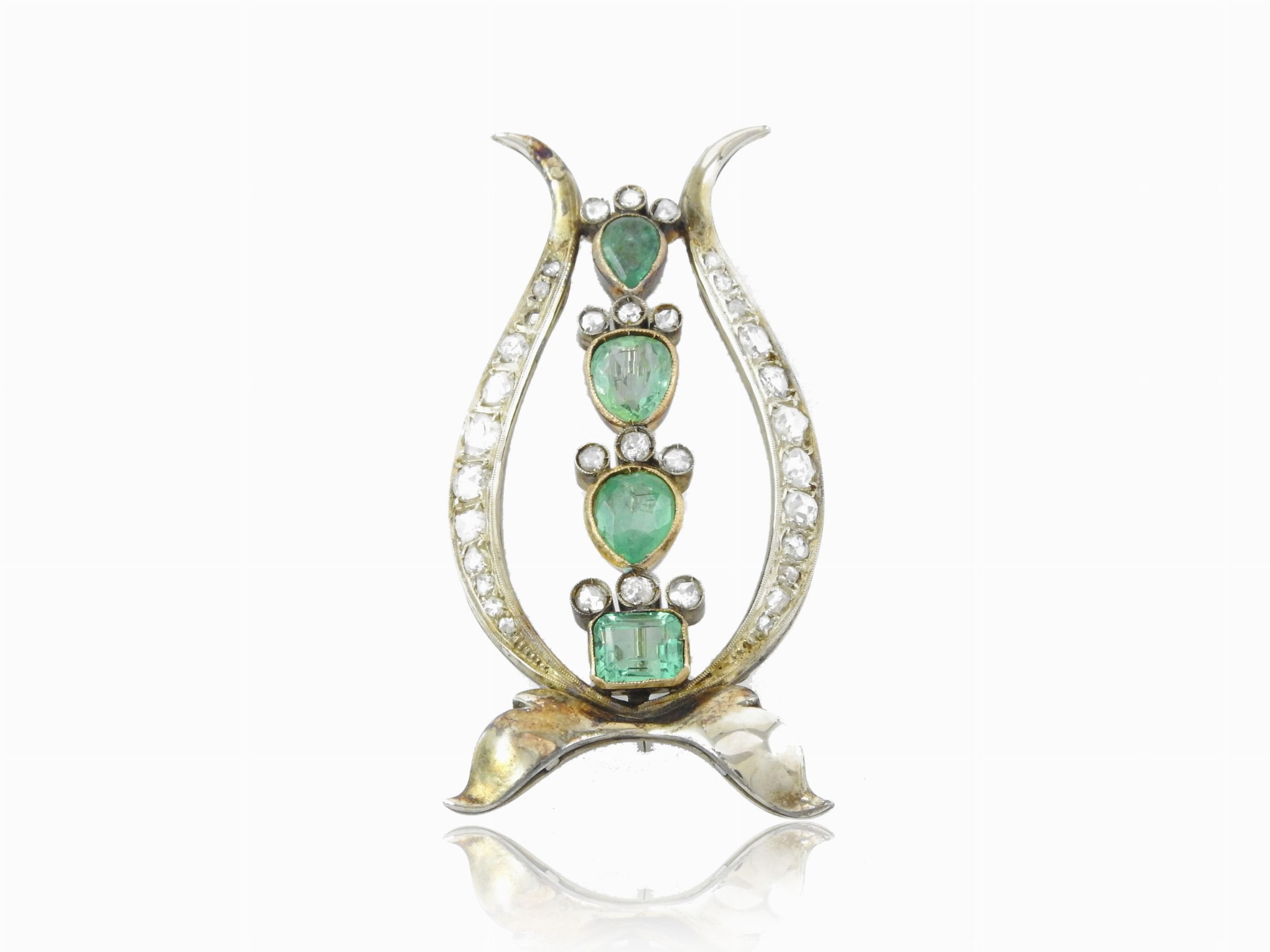 Spilla in oro a basso titolo e argento con diamanti e smeraldi