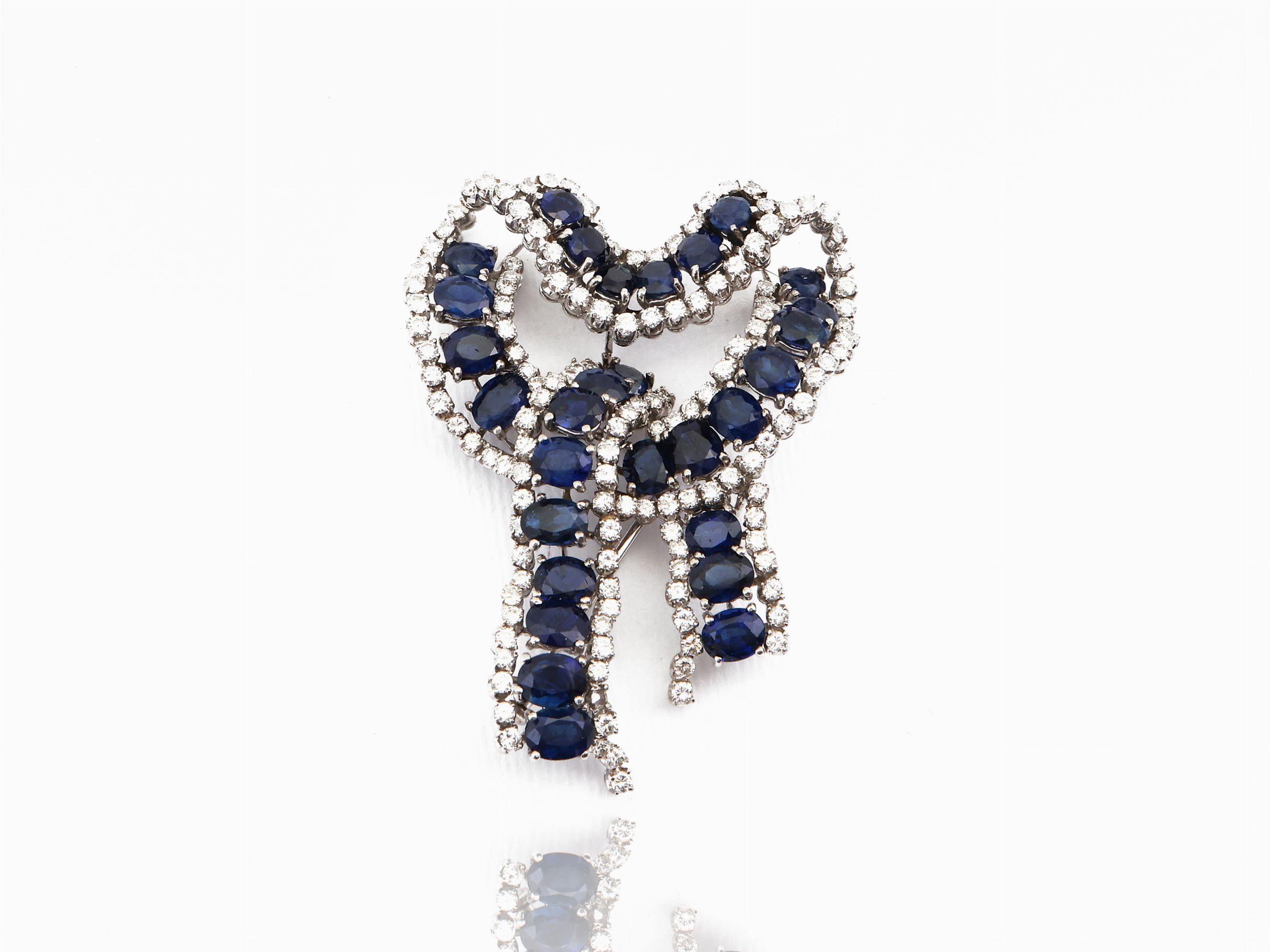 Spilla in platino e oro bianco con diamanti e zaffiri