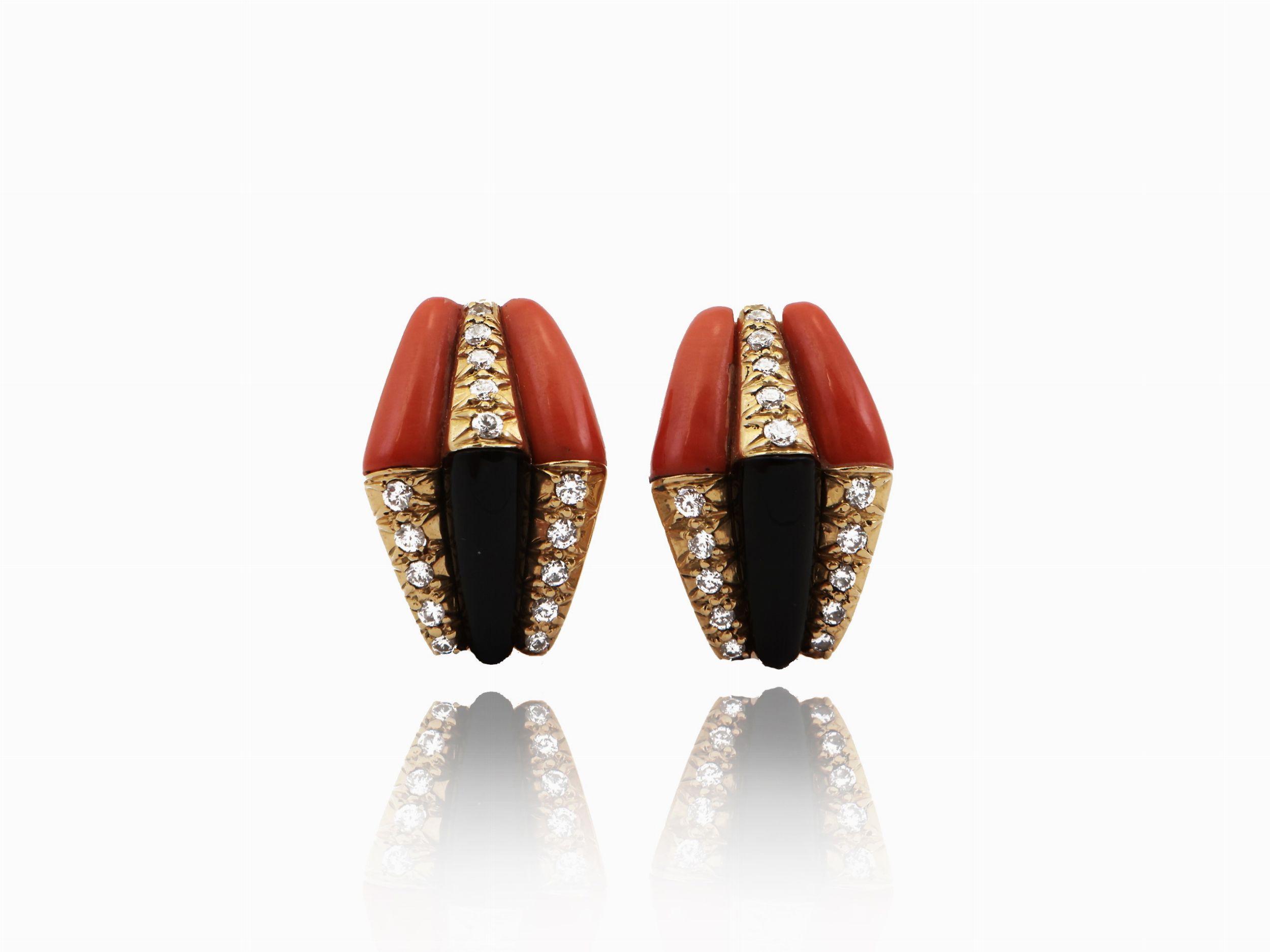Tiffany & Co, orecchini in oro giallo con diamanti, coralli rosso arancio ed oni [..]