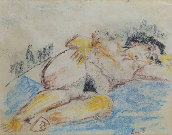 22x28 pastelli su carta Opera firmata in basso a destra Bozzetto al retro di un nudo sdraiato Esp.:-2011 Venezia Palazzo Grimani Fausto Pirandello (etichetta al retro)