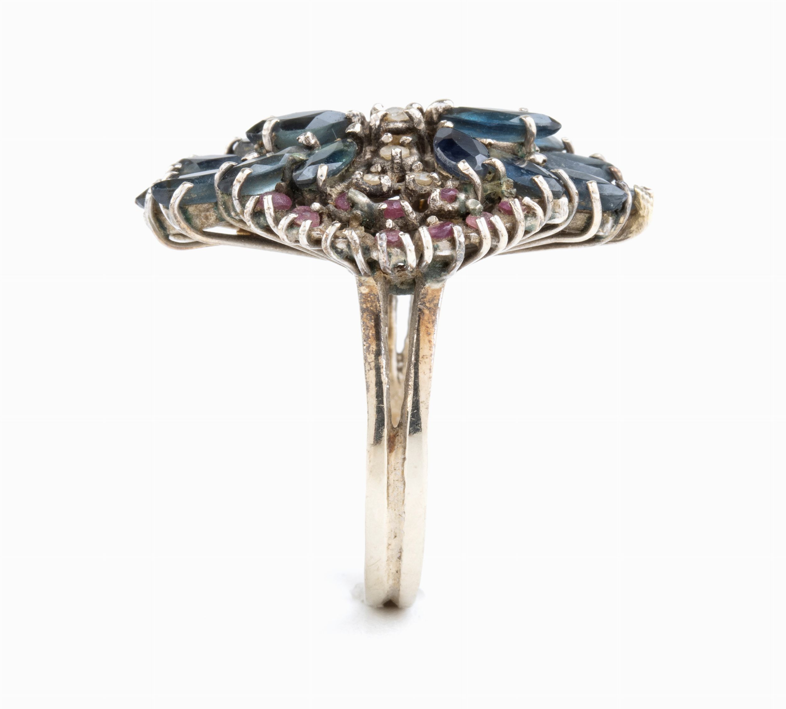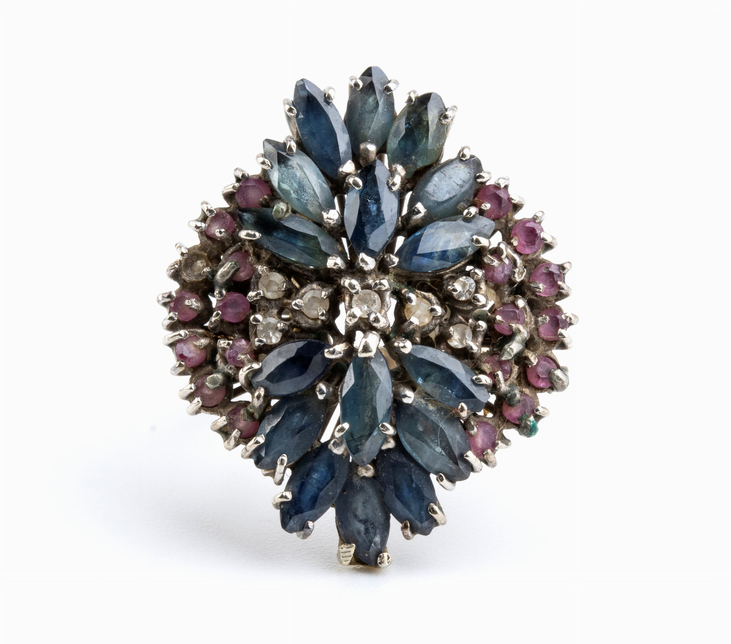 motivo floreale, incastonato con rubini, zaffiri e diamanrti.Misura IT 15 - Misura USA 7. Peso 6,6 gr.Stato di conservazione: *** discreto.
