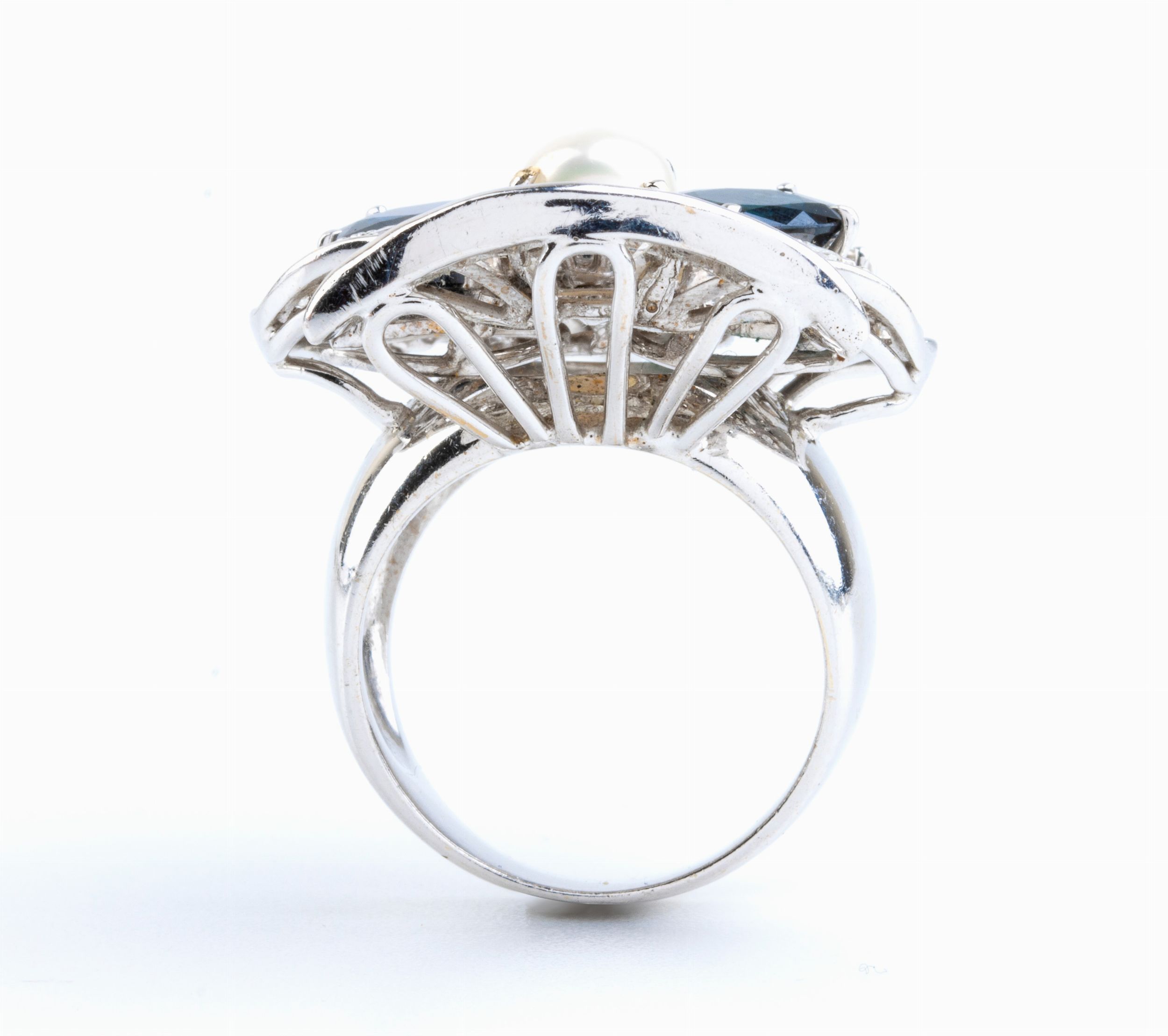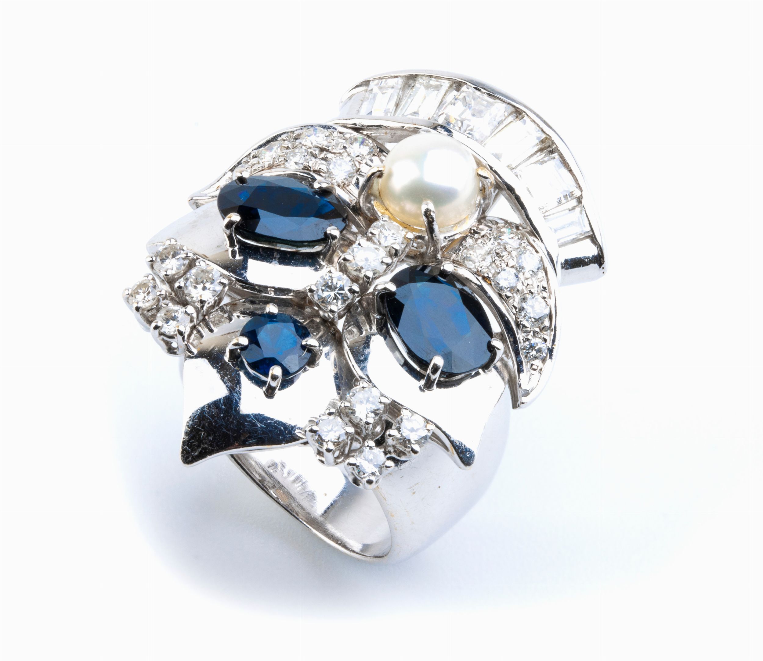 montatura a forma di maschera con diamanti di varie forme, tre zaffiri ed una perla coltivata d'acqua salata.