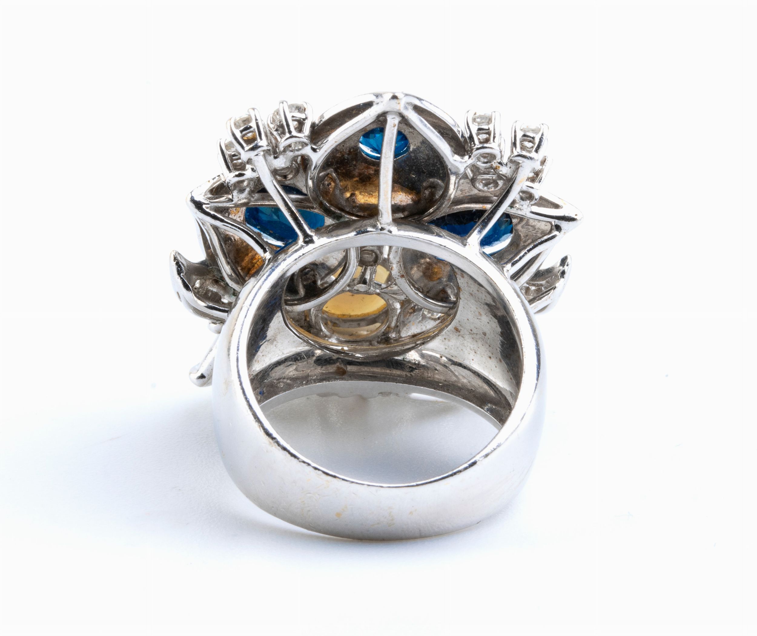 Zaffiri: n. 02 forma ovale, taglio composito, n. 01 forma rotonda, taglio composito, circa 3.50 ct tot.