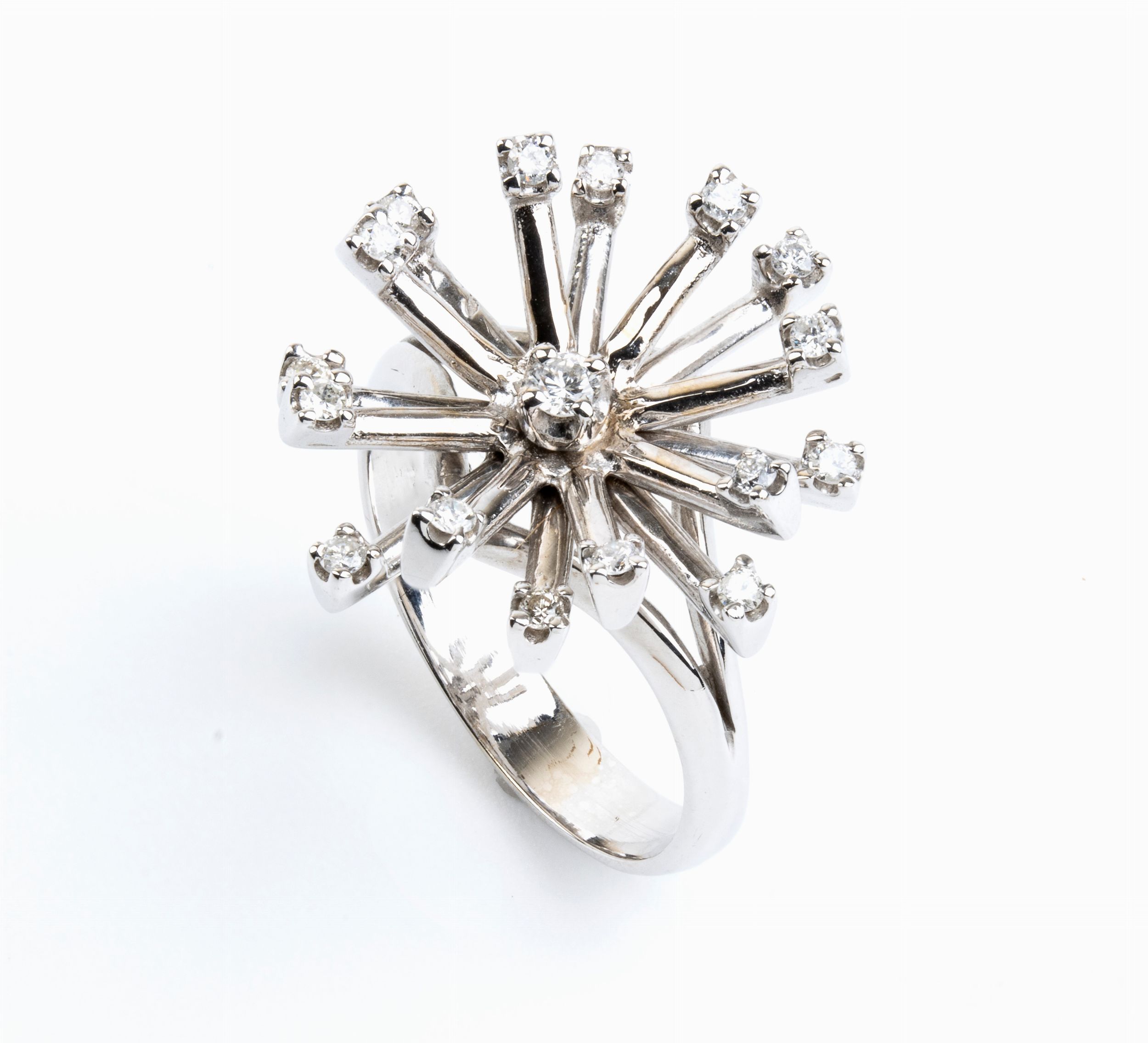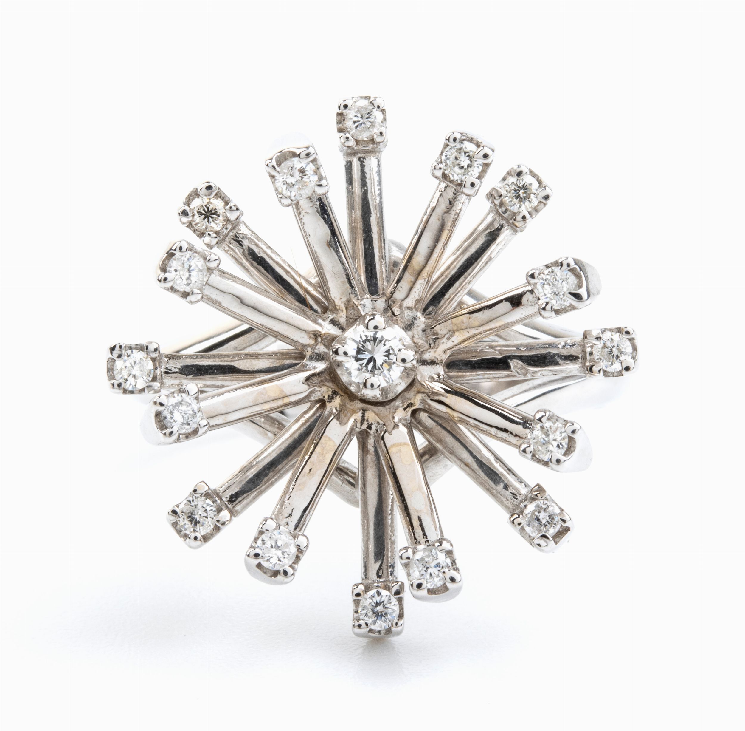 con motivo di steli punteggiati da diamanti.N. 17 diamanti di forma rotonda, taglio brillante, circa 0.55 ct, F-G, VVS-SI. Misura ITA 22 - US 10. Diametro frontale 22 mm. Peso 9 gr.Stato di conservazione: **** buono.