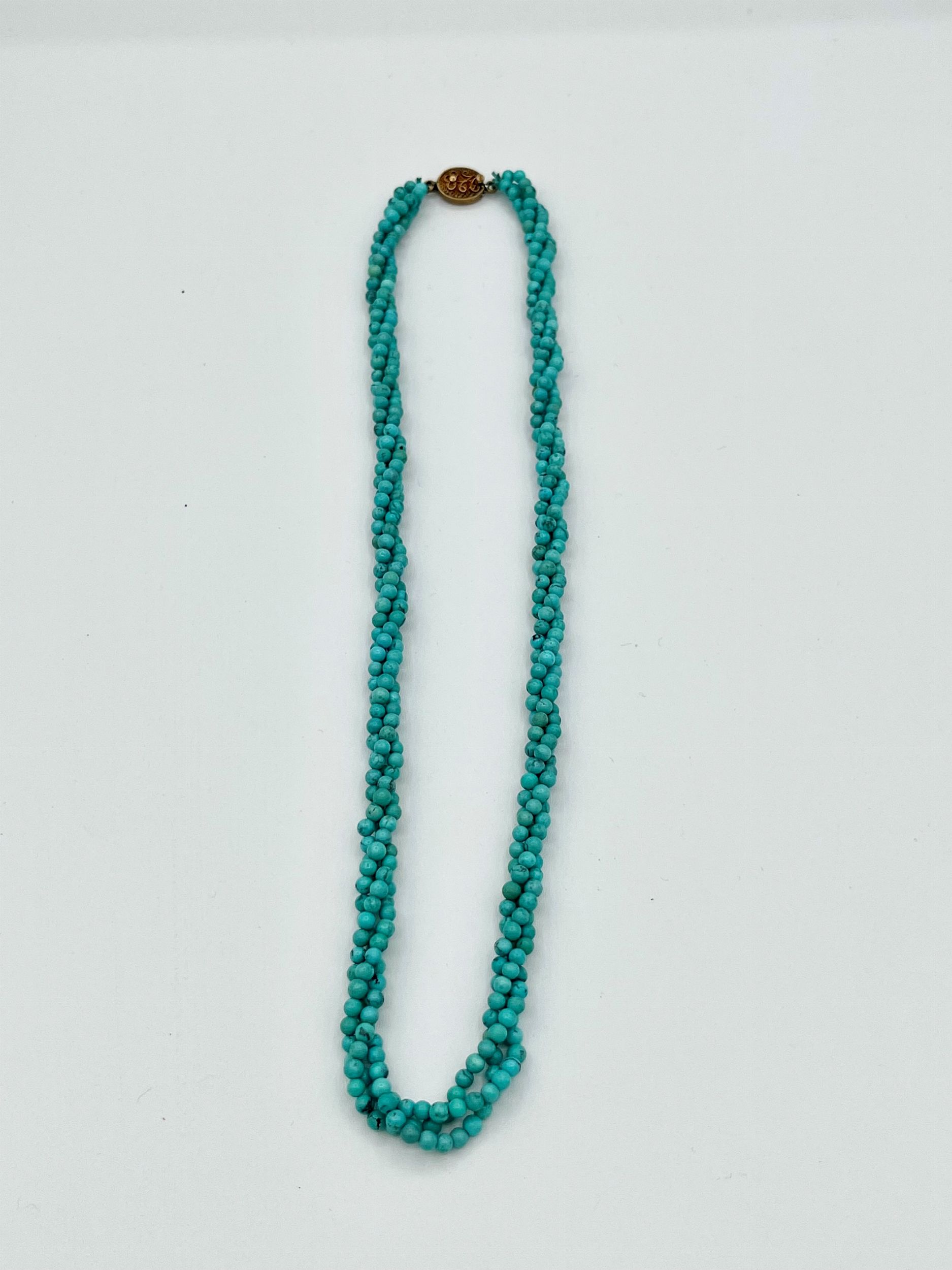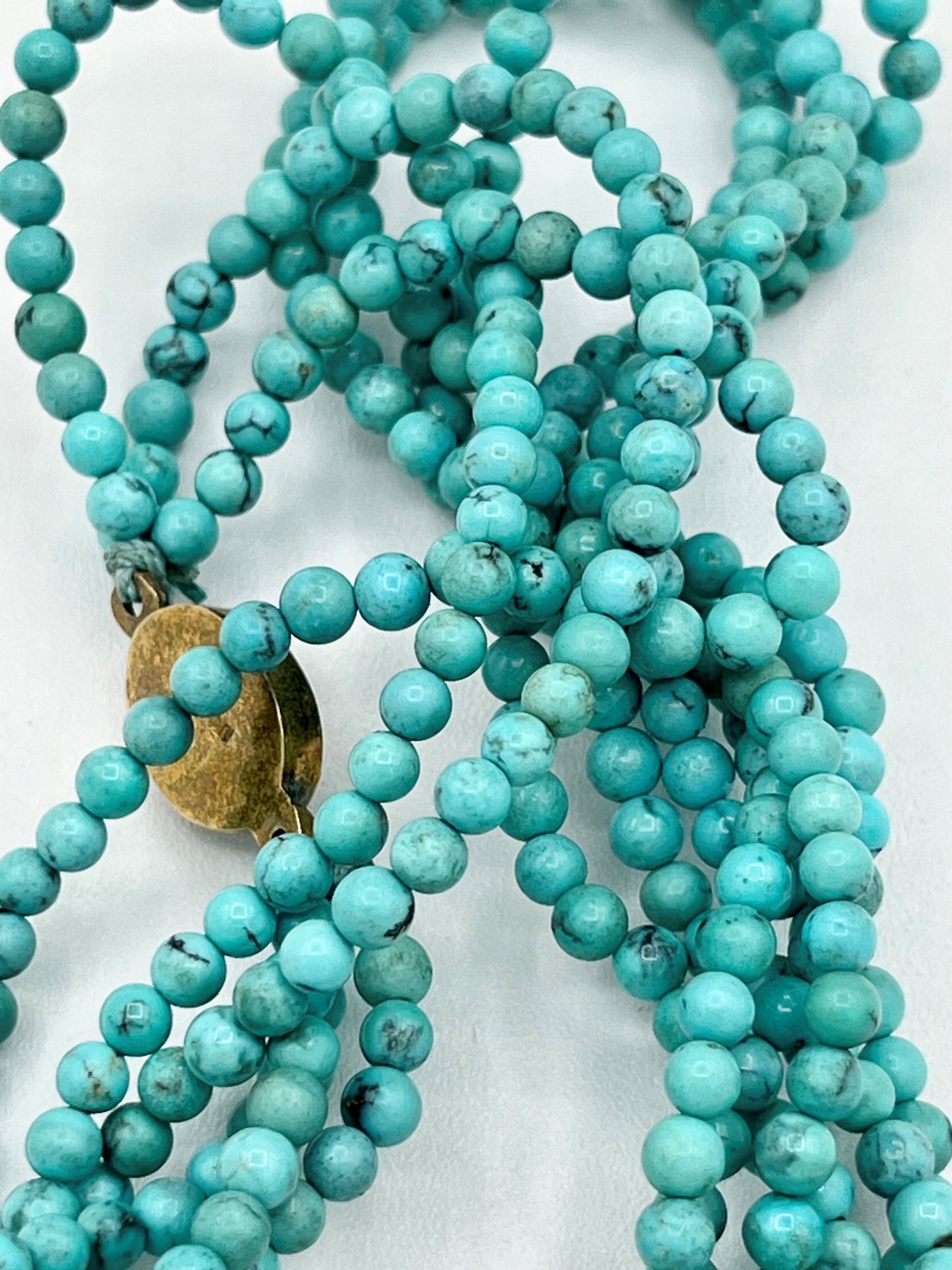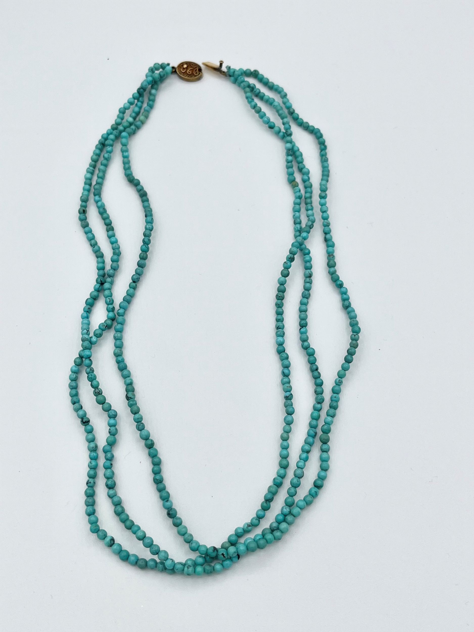 a tre fili di piccole sfere turchese con fermezza in argento dorato. Punzonato SILVER. Lunghezza 51 cm. Peso 29,2 gr.Stato di conservazione: **** buono.