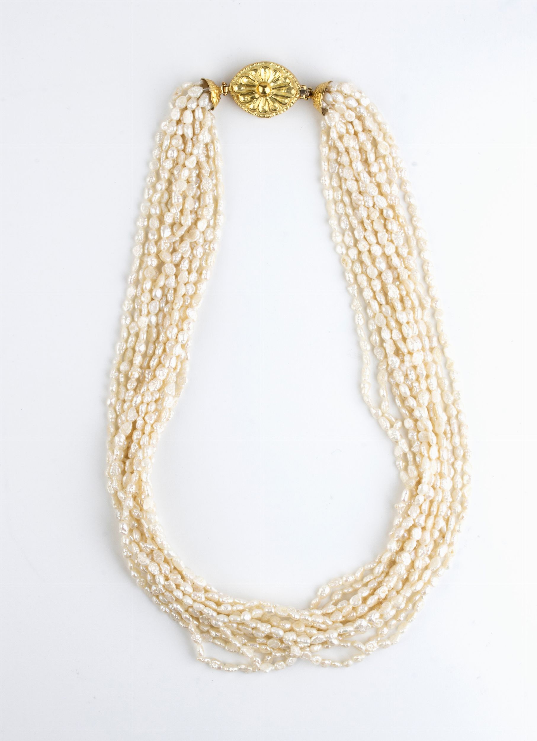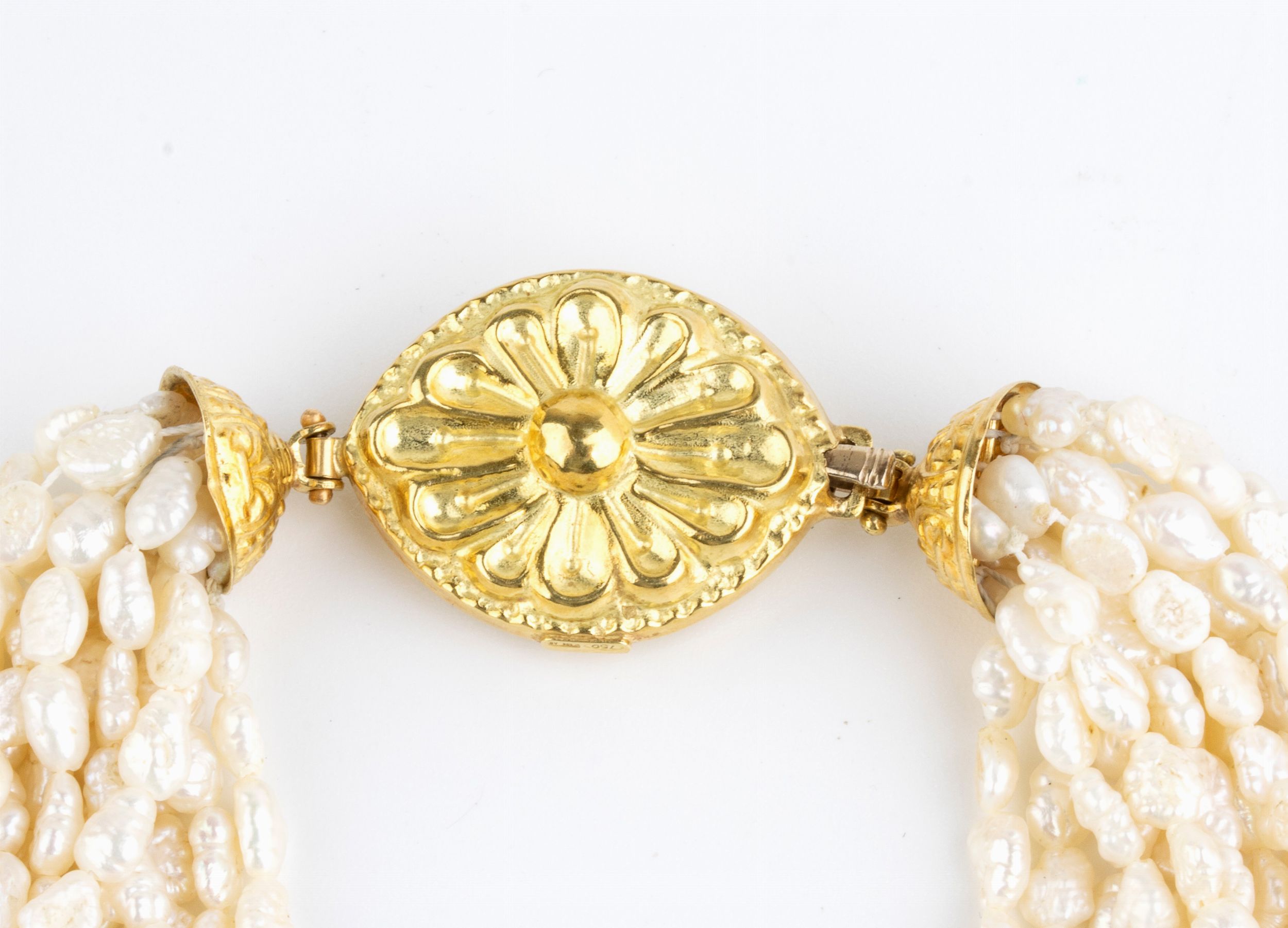 a tredici fili di perle coltivate d'acqua dolce con fermezza a scomparsa in oro giallo 18k.Punzonato 750 - 434 AR. Lunghezza 54 cm. Lunghezza fermezza 4,2 x 2,5 cm. Peso 106 gr.Stato di conservazione: ***** eccellente.