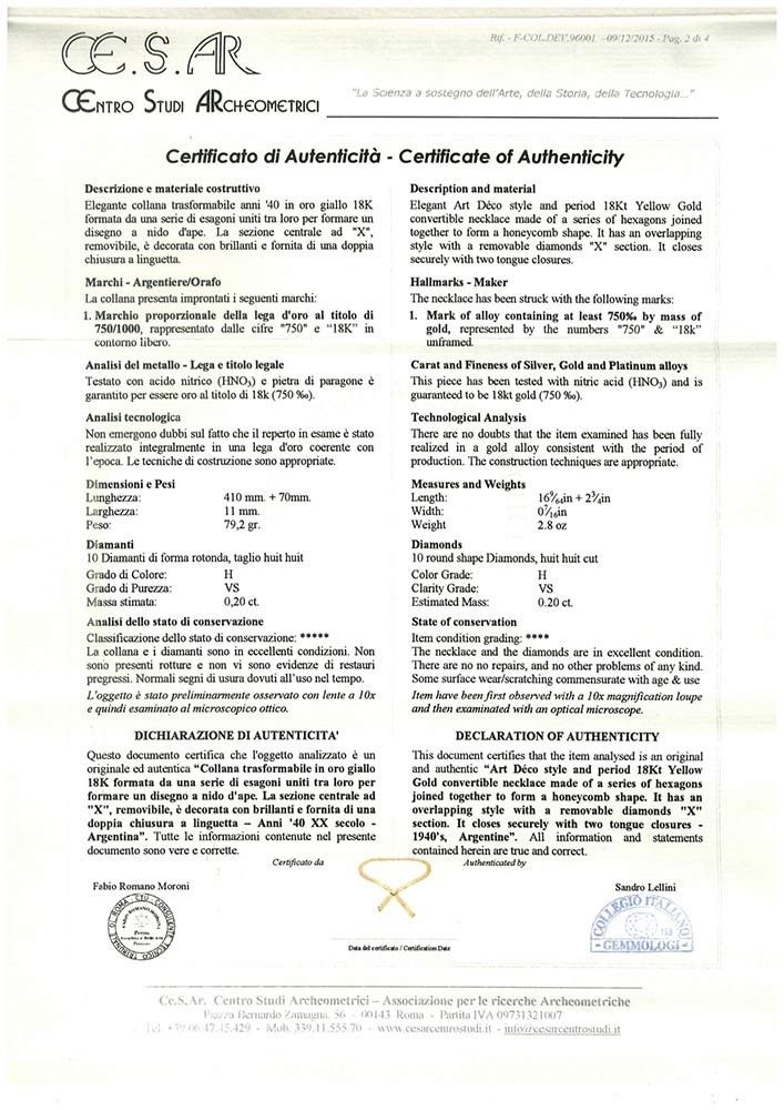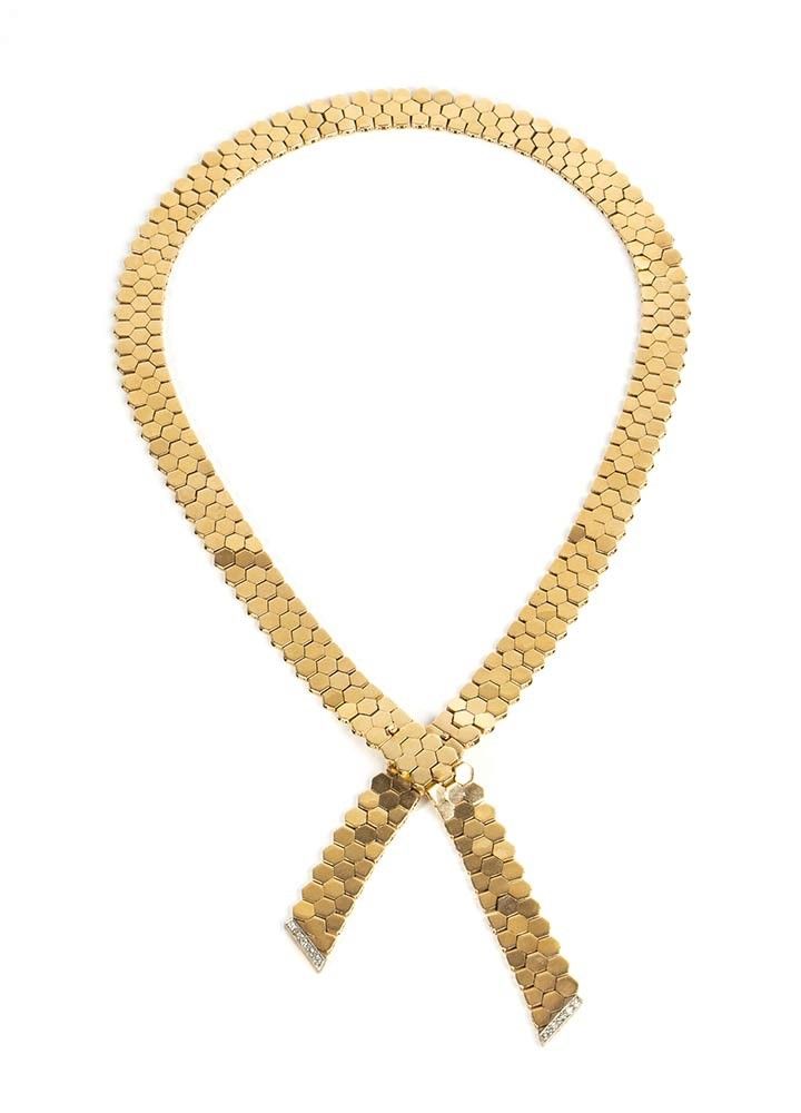 in oro giallo 18k formata da una serie di esagoni uniti tra loro per formare un disegno a nido d'ape. La sezione centrale ad X, removibile, è decorata con 10 Diamanti di forma rotonda taglio huit hui 0,30 ct circa, colore H, purezza VS. Doppia chiusura a linguetta. Punzonata 750 e 18K.