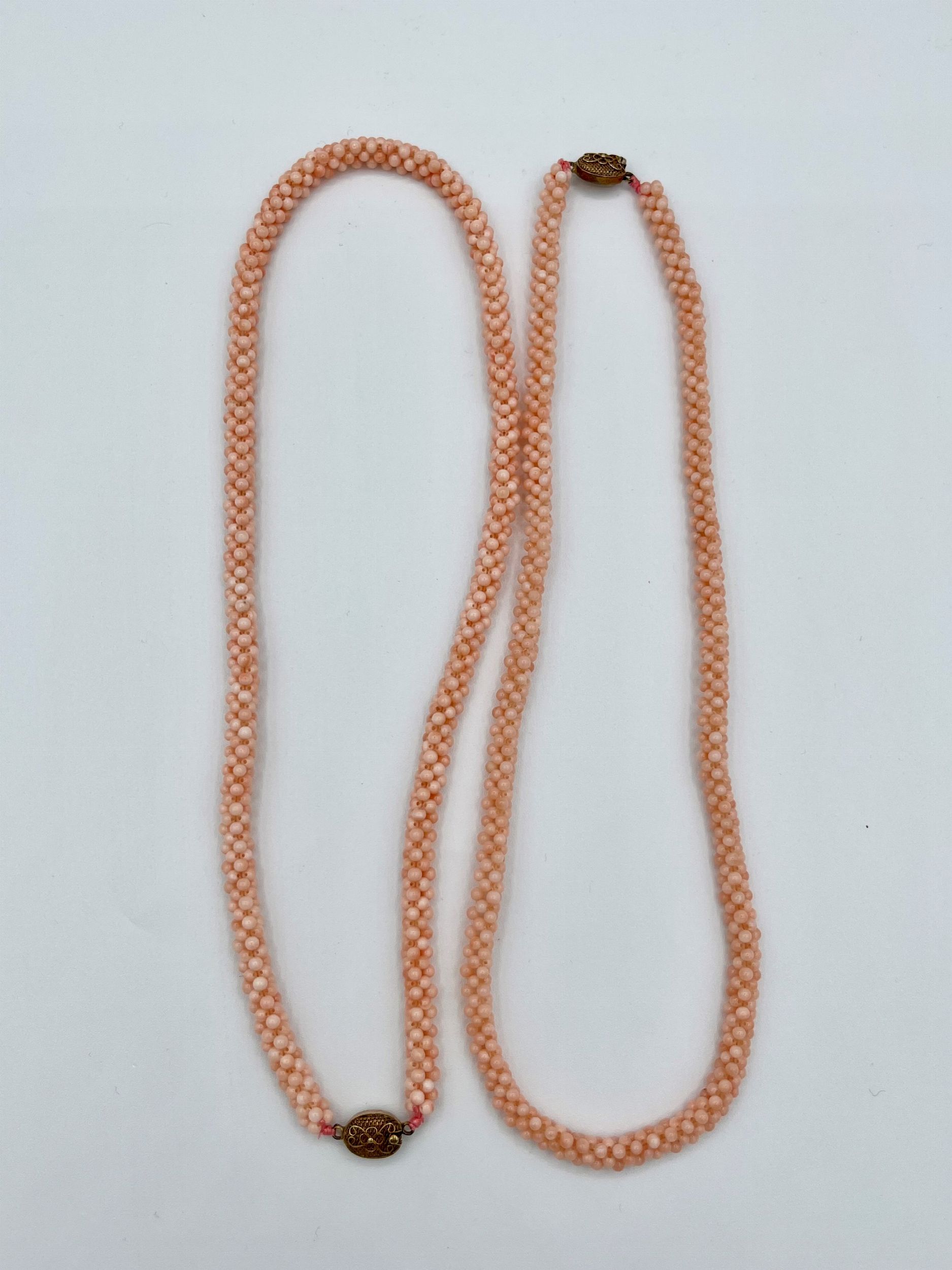 argento 900/1000, dorato, a maglia tessita con sferette di corallo rosa (corallium secundum).