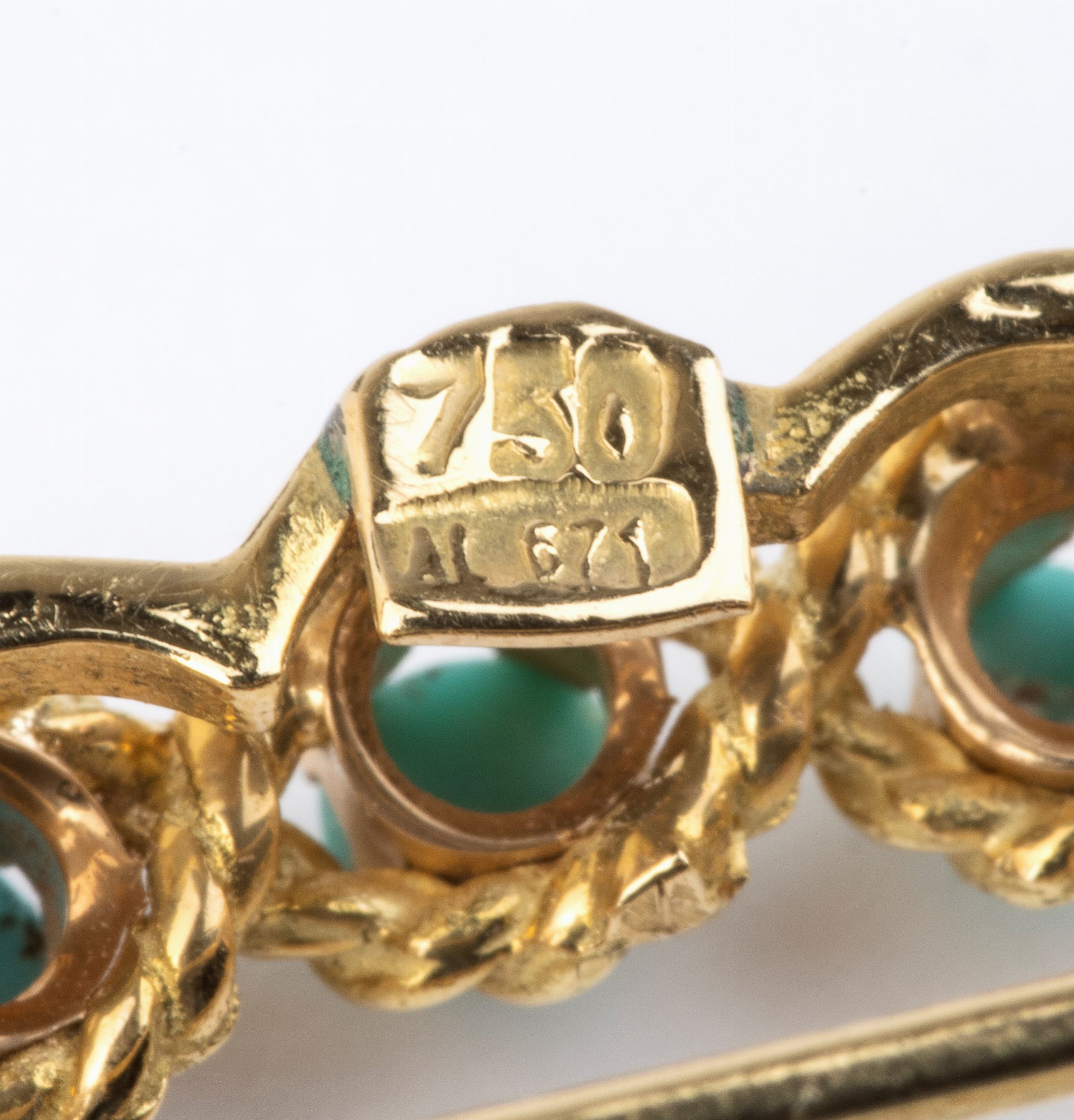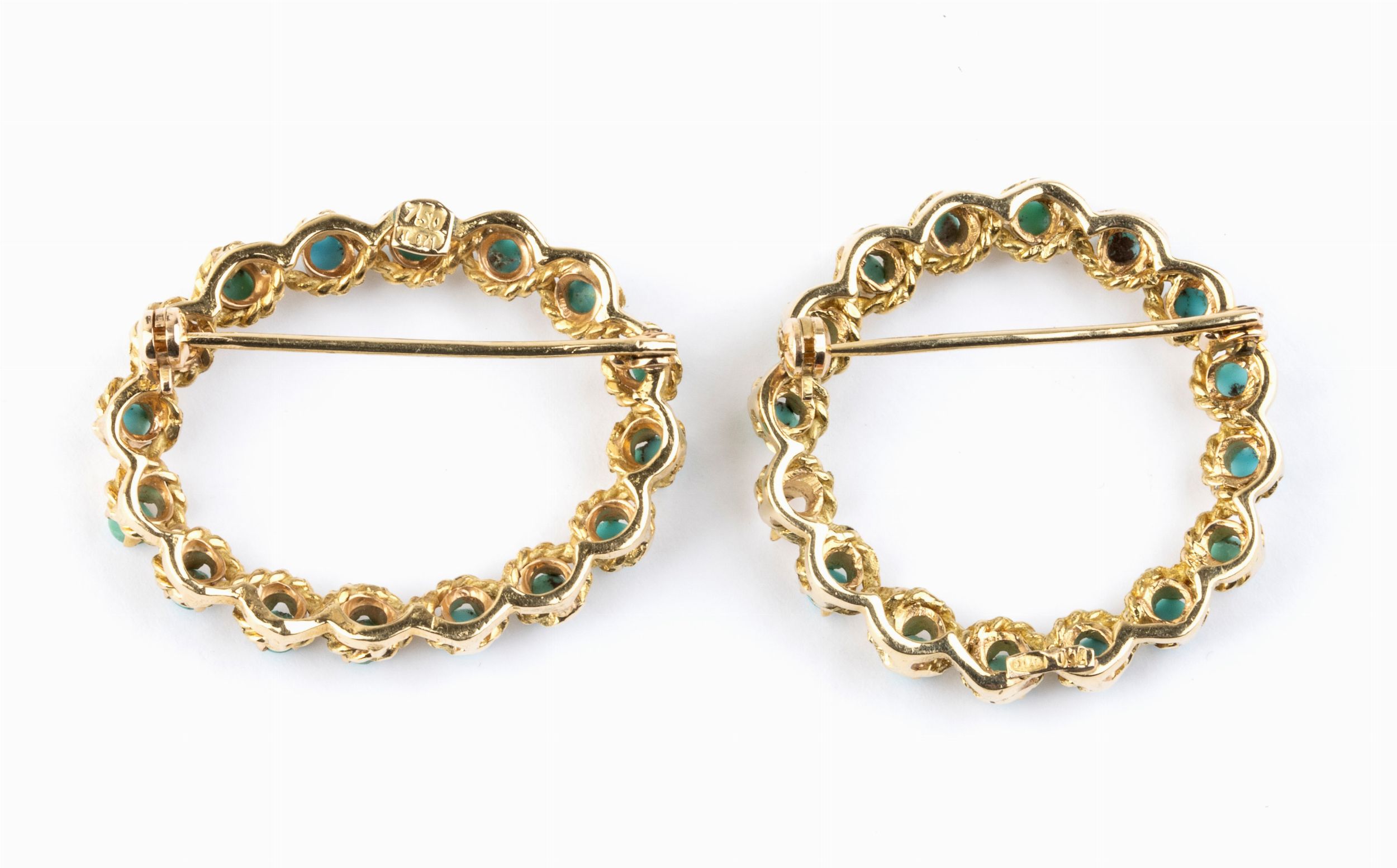 in oro giallo 18k, incastonate con cabochon di turchesi.Punzonate 750 - 671 AL. Diametro spilla rotonda 3,2 cm. Dimensioni spilla ovale 3,5 x 2,5 cm.Peso complessivo 16,4 gr.Stato di conservazione: **** buono (una turchese mancante).