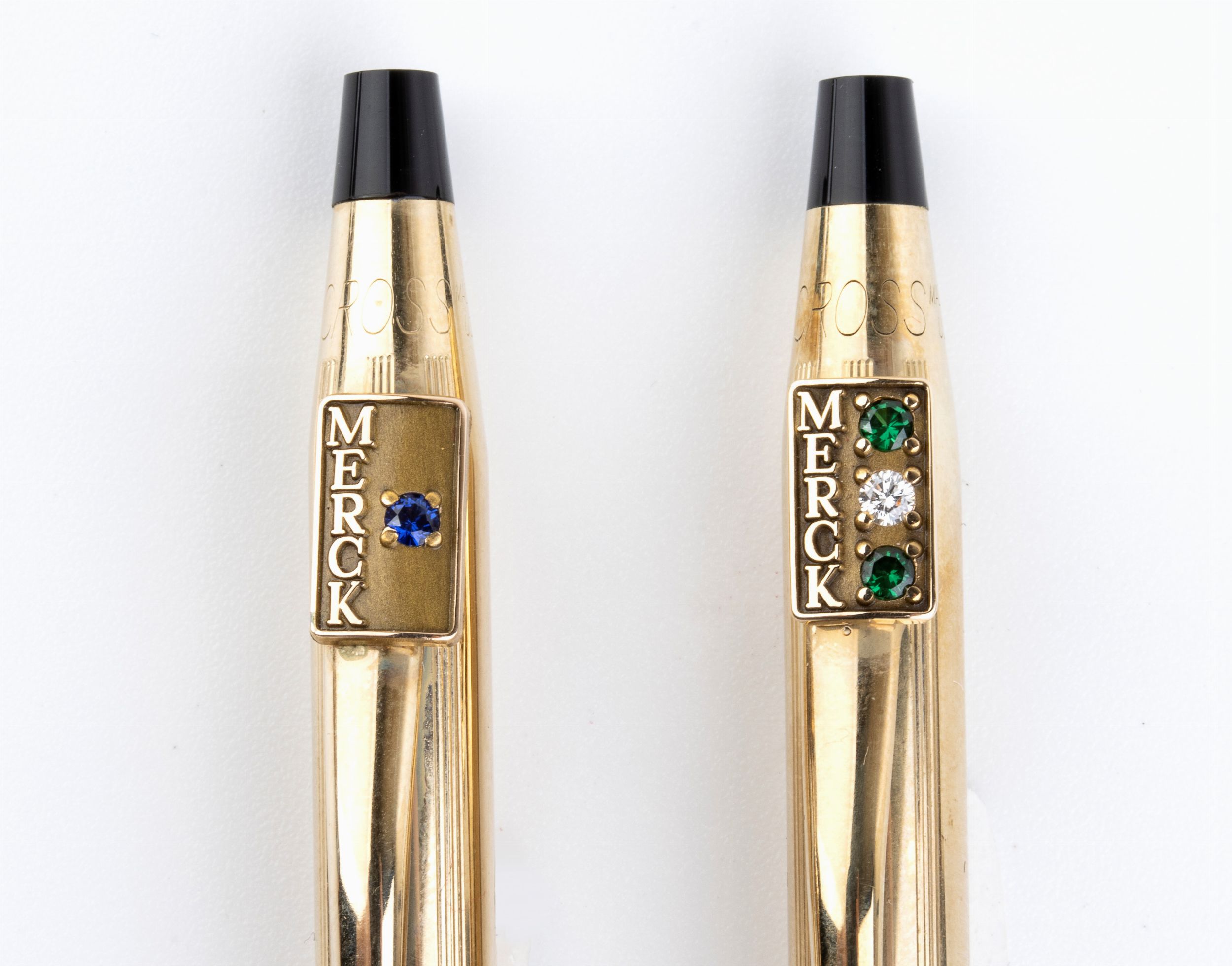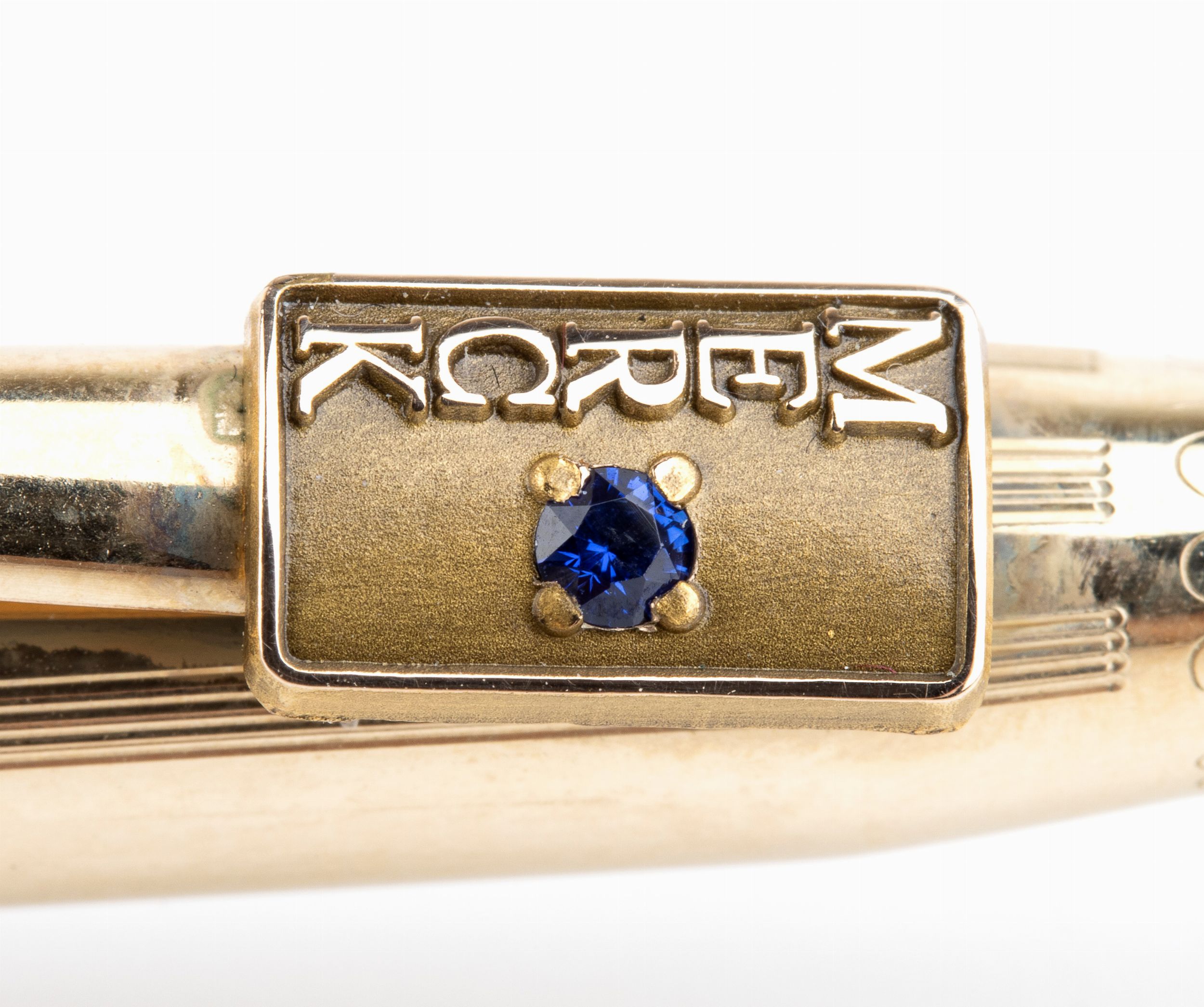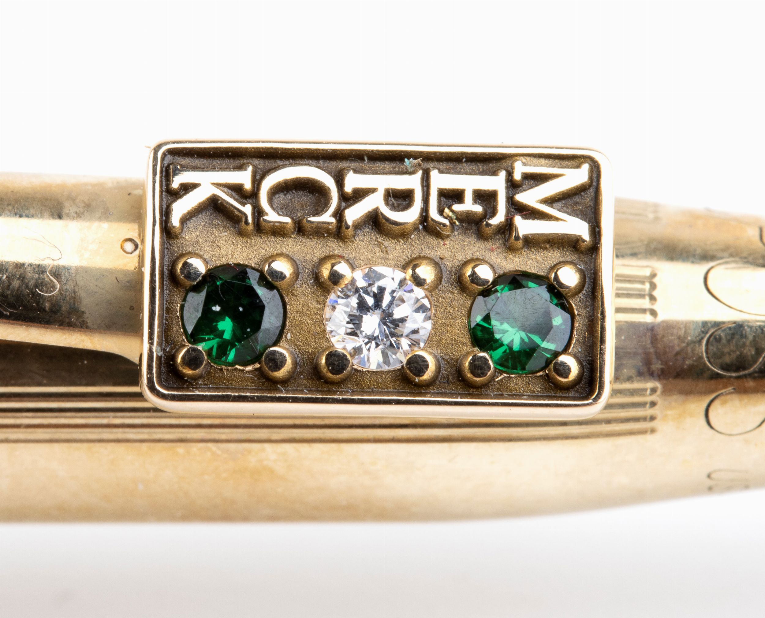 meccanismo a rotazione, corpo in metallo dorato, clips personalizzate dall'aziena Merk con brillanti e pietre di colore.