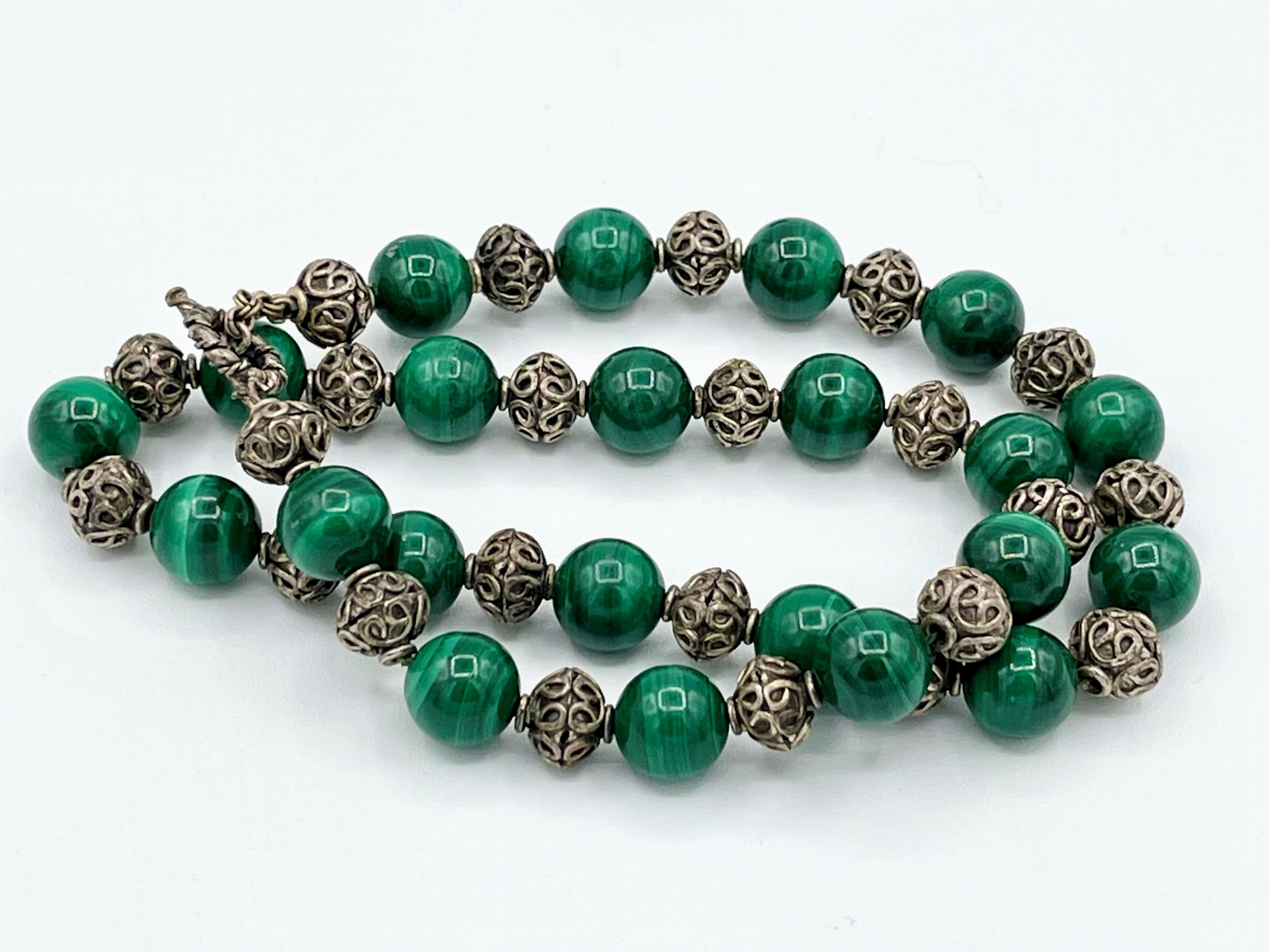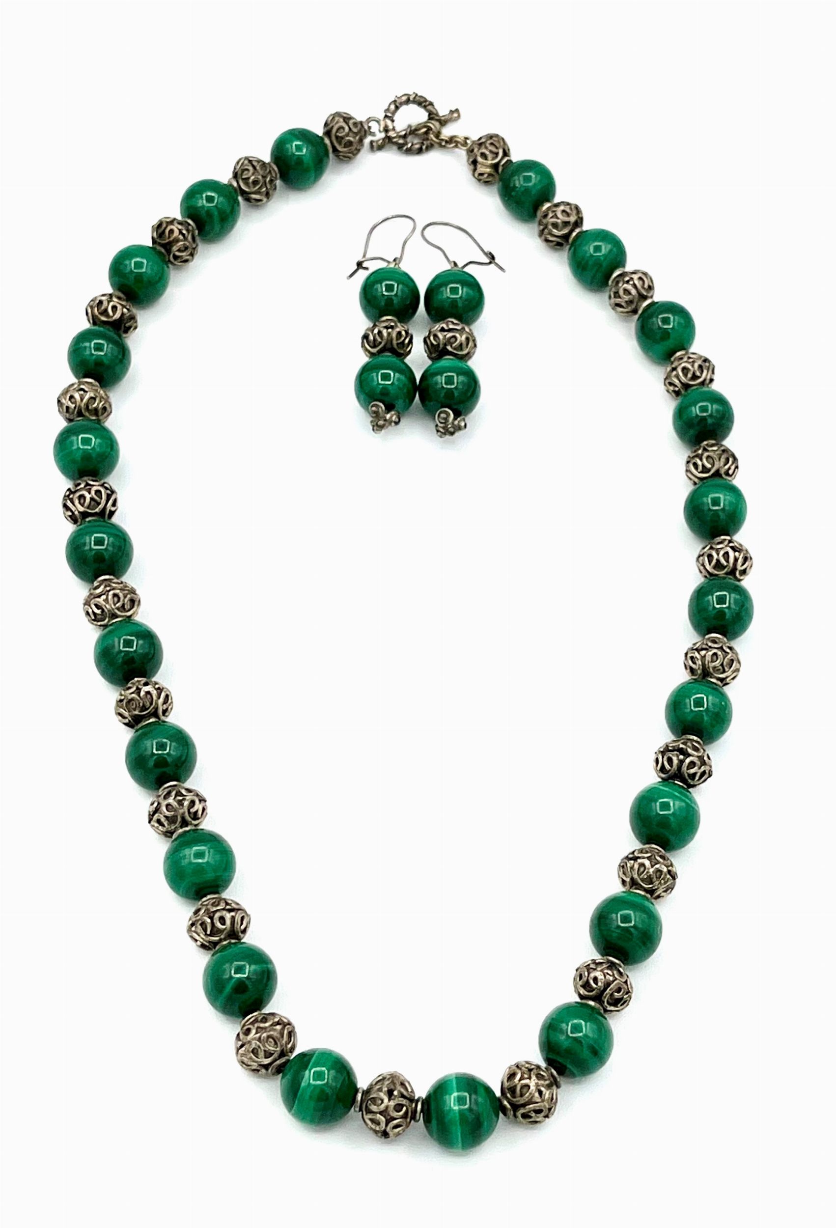 ad un filo di sfere di malachite separate da distanziali in argento. Diametro sfere di malachite 12 - 12.5 mm. Lunghezza collana 53 cm. Lunghezza orecchini 6 cm. Peso complessivo 154 gr. Stato di conservazione: **** buono.