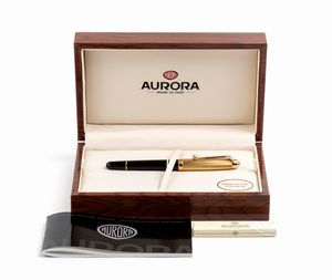 corpo e cappuccio in resina verde con finiture dorate, pennino in metallo riportante la dicitura Aurora. [..]