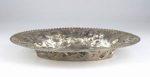 di forma ovale, interamente sbalzato e cesellato con fiori foglie. Argento 800/1000, punzonato con i marchi in [..]