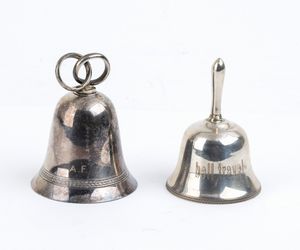 Peso complessivo: 89 gr. 1) Campanella in argento con due cerchi: dimensioni 7 x 5,2 x 5,2 cm. Punzonata 8. X. [..]