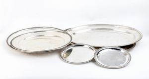Peso complessivo 5000 gr. argento 800/1000. 1) Due piccoli vassoi con bordo impero rotondi: 20 x 20 cm. Punzonato [..]