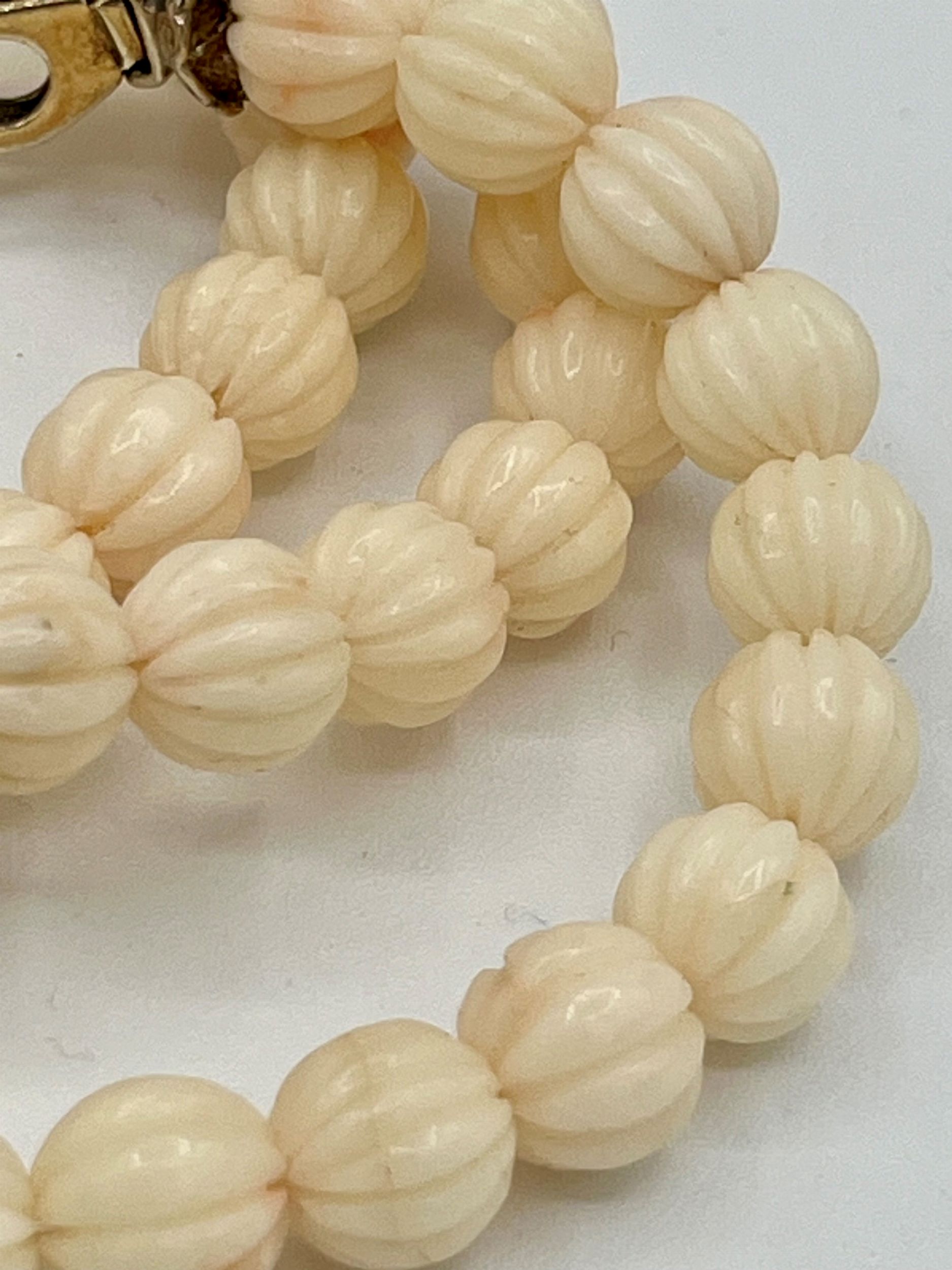 oro giallo 18k, ad un filo di sfere baccellate di corallo bianco (corallium Konjoy).