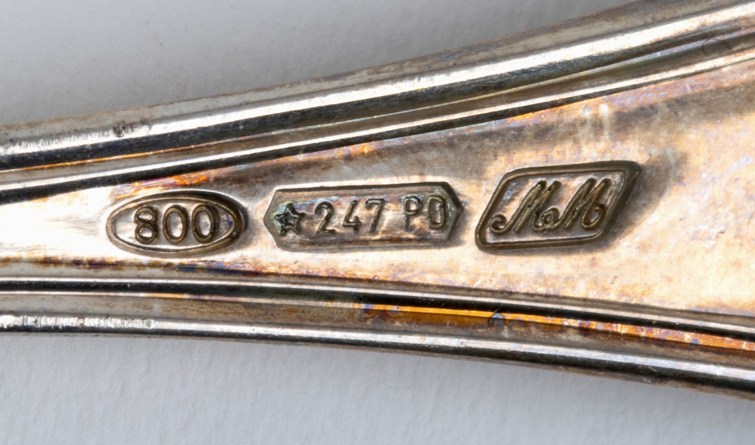 2) due cucchiaini da dolce: lunghezza 12,3 cm. Punzonato 800.