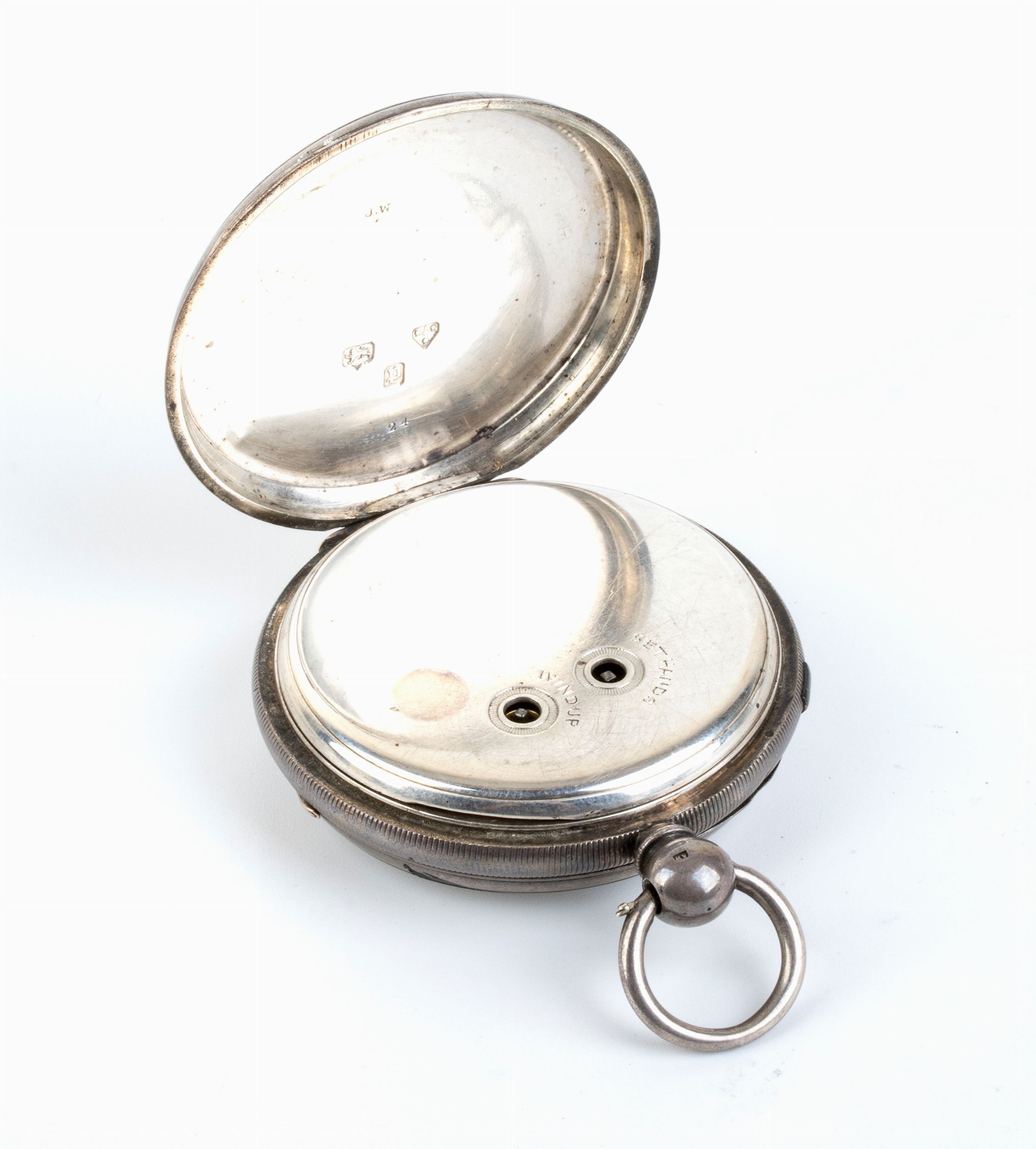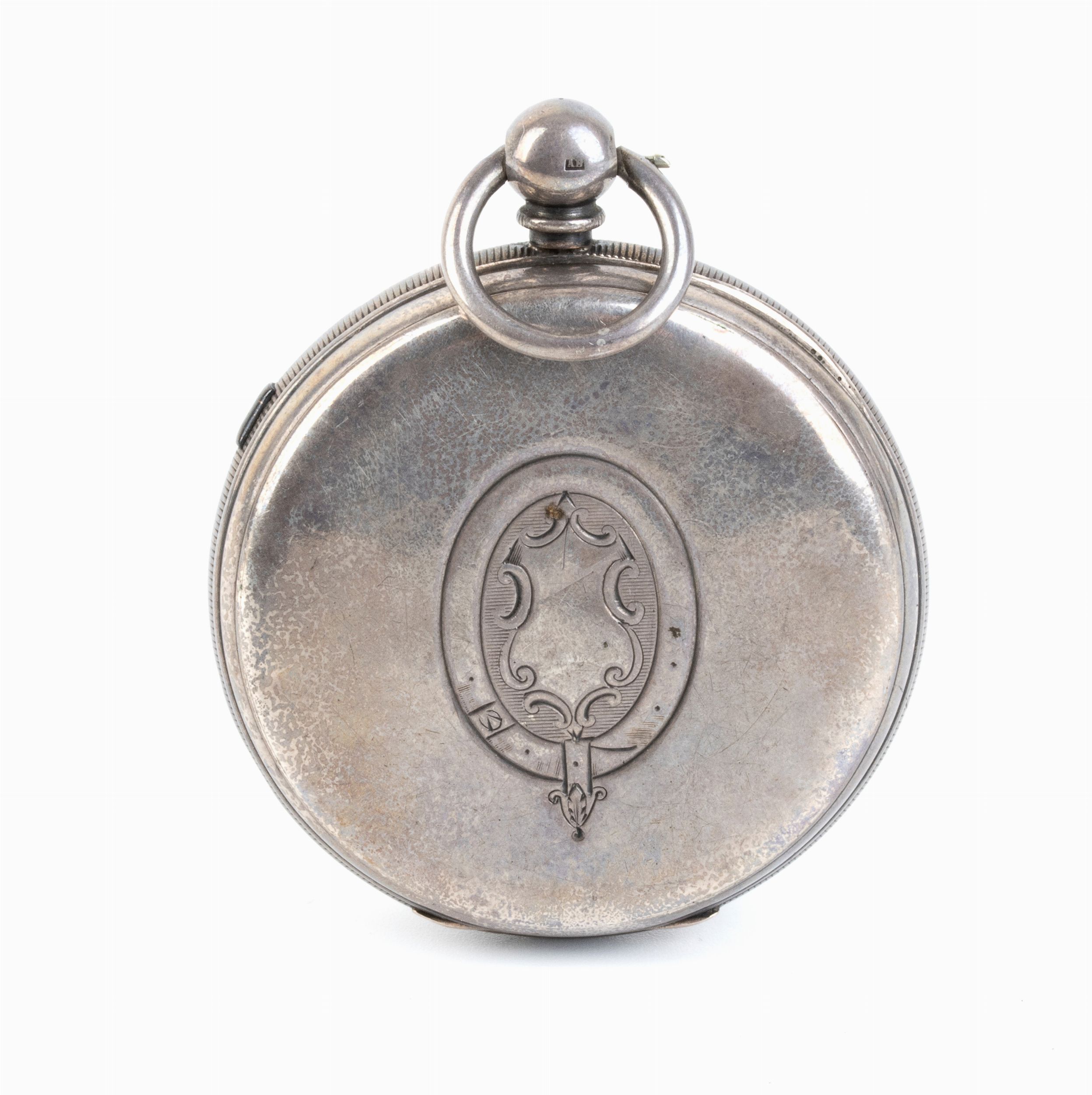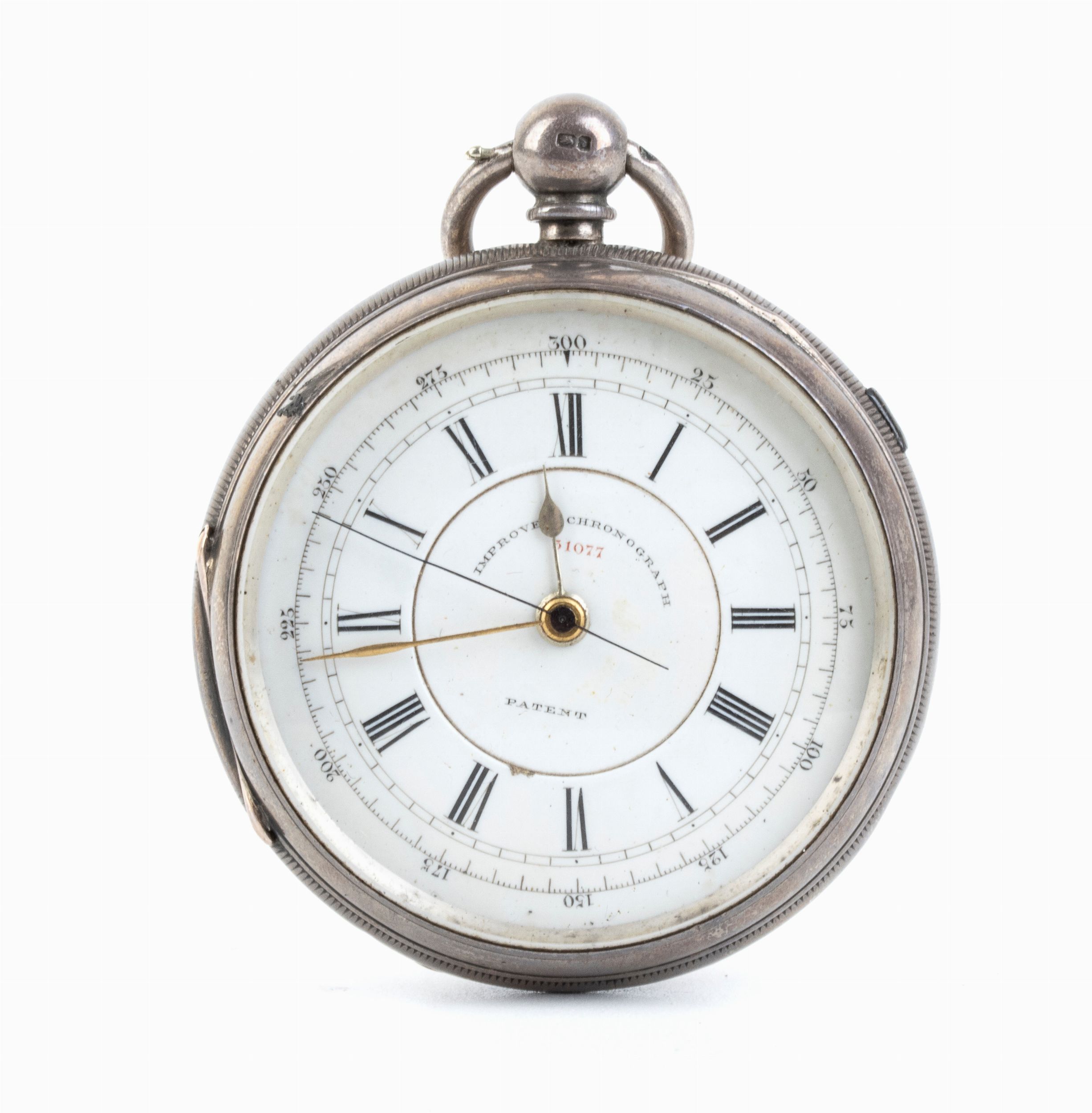 cassa in argento 925/1000 punzonata Chester 1878-79, quadrante in smalto bianco con numeri romani, cursore laterale per attivare e fermare il movimento. Rimessa dellora e carica a chiave.