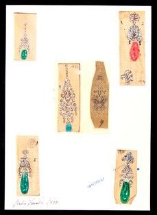 Progetti per gioielli anni '30 disegni di sei orecchini pendenti in pietre di colore e diamanti.Quattro tecniche miste su velina applicata su cartoncino e due una tecniche miste su cartoncino.Stato di conservazione: **** buono.