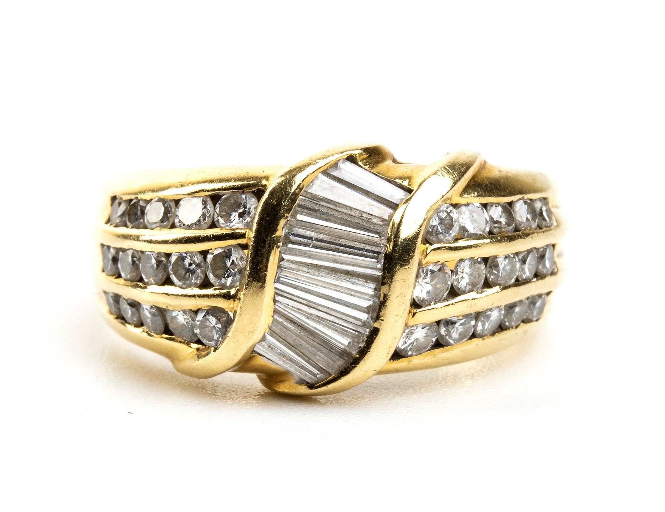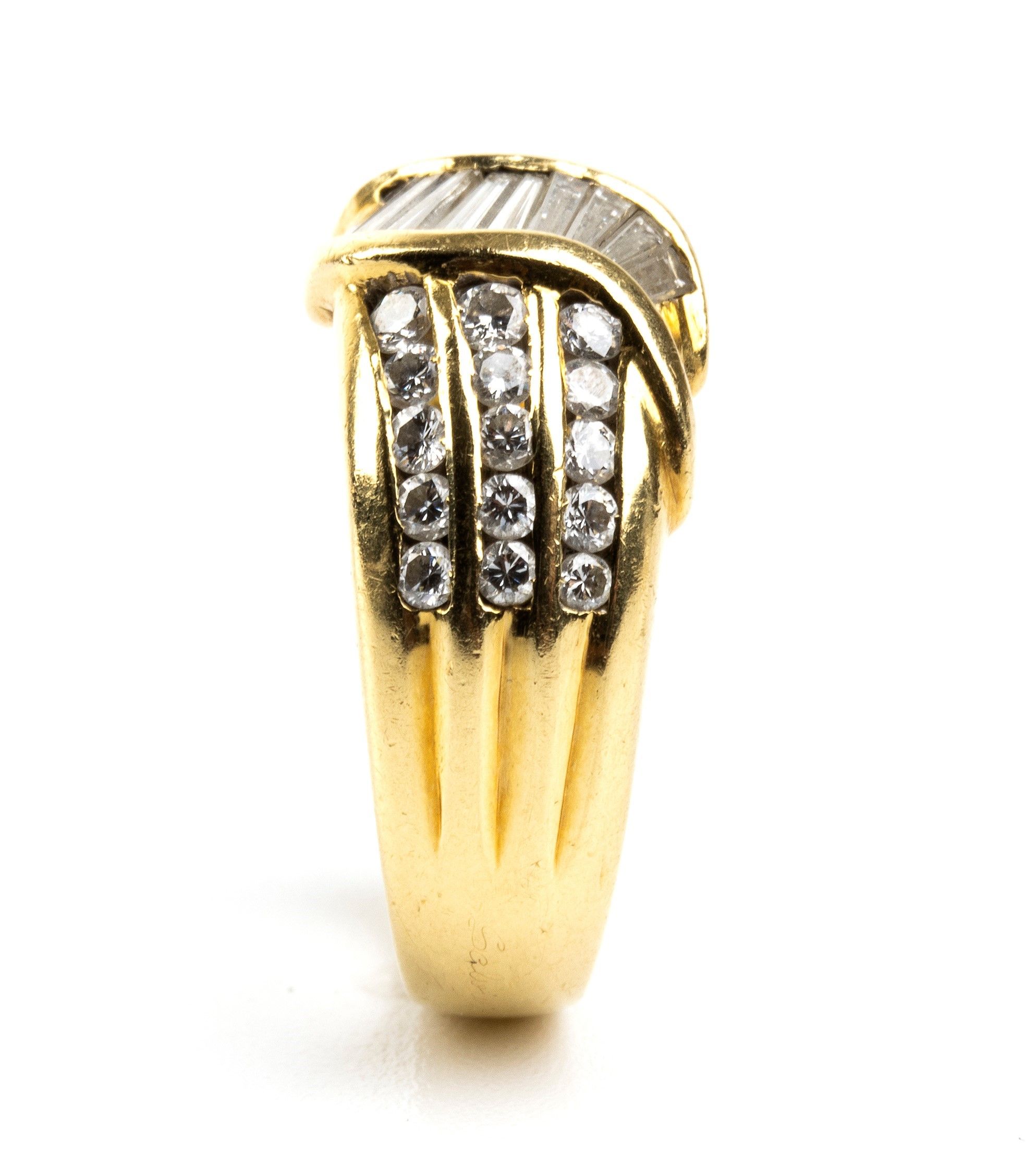 modellato come una fascia in oro giallo 18k, incastonato con file di diamanti taglio brillante e nastro in diamanti baguette. Firmato SALVINI.